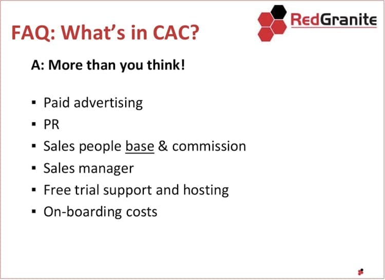 顧客獲得コスト(CAC):SaaSのようなサブスクリプションベースの企業は、CACに前払いし、顧客が時間とともに徐々に支払うためその支出を補充するリスクを負います。 事前のCACが大きいほど、少しずつ返済に時間がかかります。