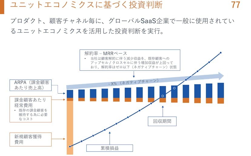 個人向け・法人向けに金融系のウェブサービスを展開している日本のSaaS企業であるマネーフォワードの決算説明書です。このように、MFも「顧客あたり」の利益、費用と計上していて、ユニットエコノミクスに基づいて投資家達に説明していますね。