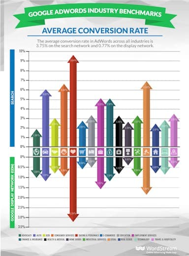 が、一般的に、12%のコンバージョン率がリードジェネレーションのランディングページには良いとされています。そして、12%のコンバージョン率があることは、競合他社の約90%よりもあなたのビジネスがリードしていると思って良いでしょう。 ちなみにGoogle広告とGoogle検索によるコンバージョン率のWordstreamの資料を参考を見ると、業界全体の平均は3.75%であるとしています。