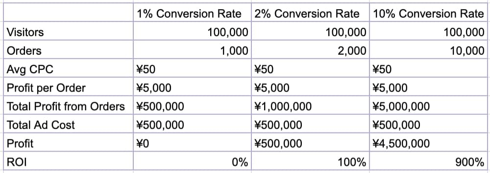 この例では、さらにクリック課金(PPC)キャンペーンからほとんどのトラフィックを得ています。平均CPCが¥50で、ビジネスが¥500,000を費やして100,000回の訪問を生み出している場合、収益性はいかがでしょうか? 2%のコンバージョン率で、ビジネスは¥500,000の利益を上げることができます。もし、このTシャツブランドがそのコンバージョン率を10%に上げることができるなら、それが一番下の行でどれだけの違いを生み出すかを見てください。
