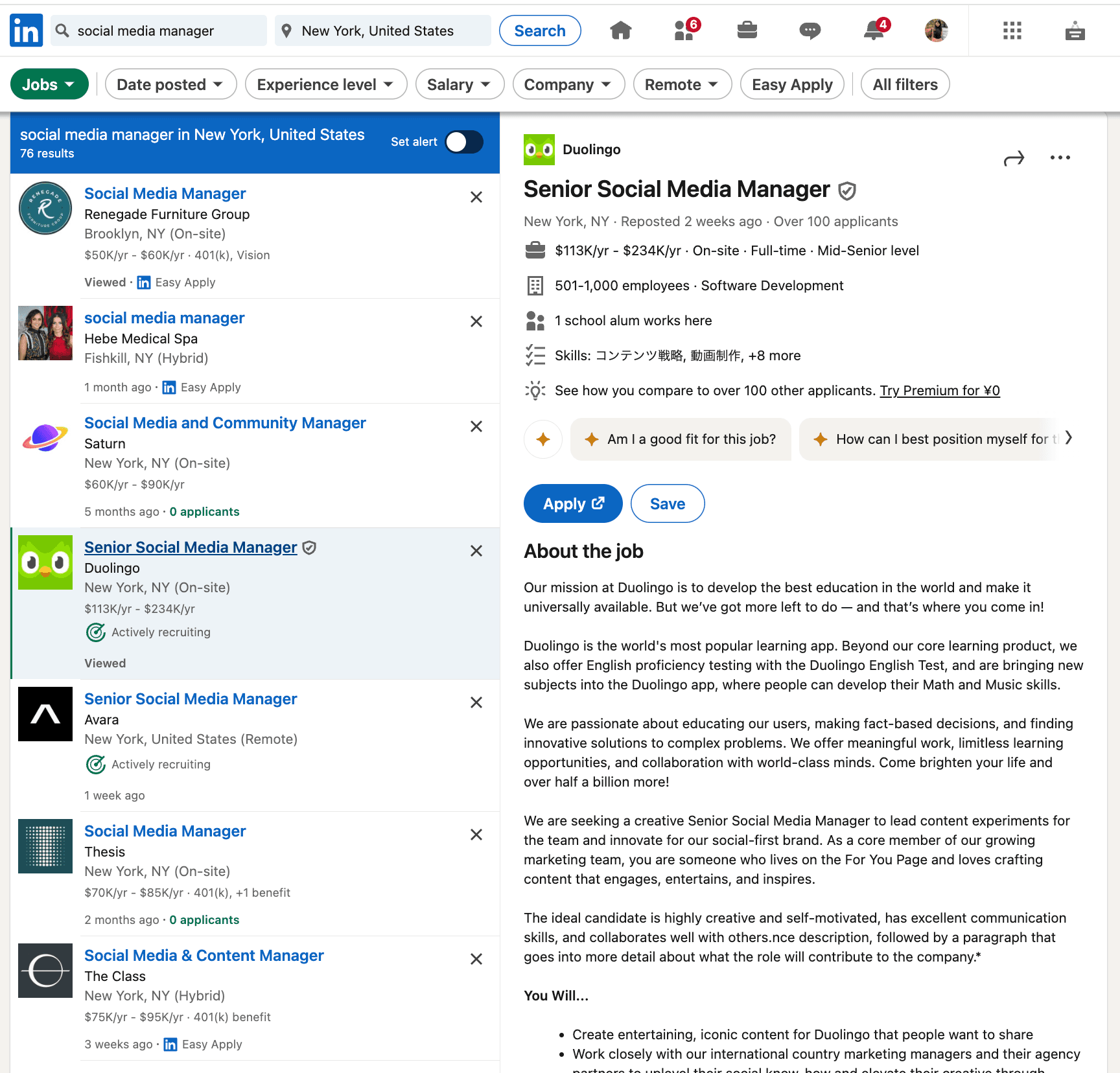 ソーシャルメディアマネージャーとはなにを具体的にするのか、を知りたい場合はぜひ求人票を見てみましょう。下記は、ビジネス特化ソーシャルLinkedIn(Microsoft社)の求人検索結果です。