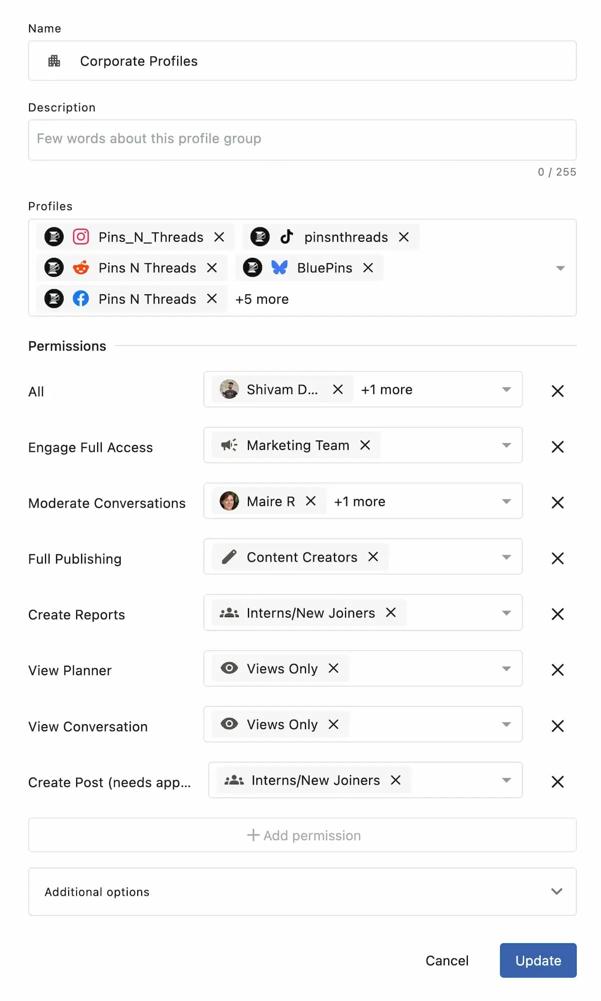 Statusbrewのアクセス管理は、ユーザーに対して投稿、エンゲージ、レポート機能へのアクセスを制限または許可するという権限設定が中心となります。各ユーザーがその業務を遂行するために必要なレベルのアクセス権限を付与することで、ミスや誤用といったリスクを最小限にとどめることができます。