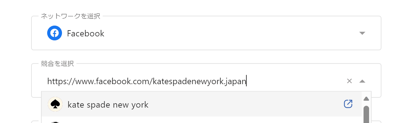 競合を選択に追加したい競合チャネルのページ名やユーザー名を正確に入力します。すると、ドロップダウンで選択肢が表示されますので、追加したい競合チャネルを選択します。