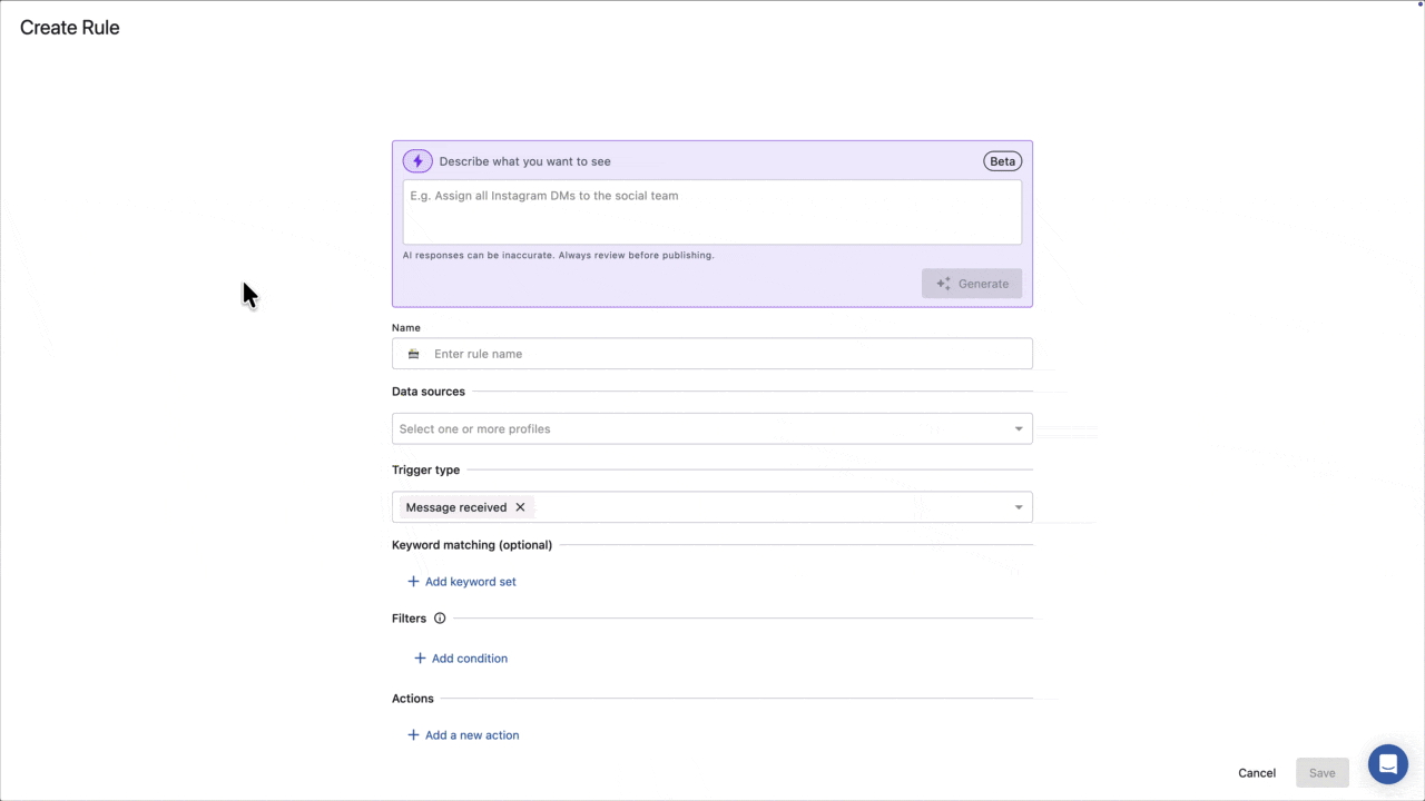 条件ごとにルールを作成する代わりに、簡単な説明文をAIに伝えることで、AIがコメント監視ルールを生成します。エンゲージにおけるモデレーション、アサイン、受信箱内のワークフローを手早く、自動化しましょう。