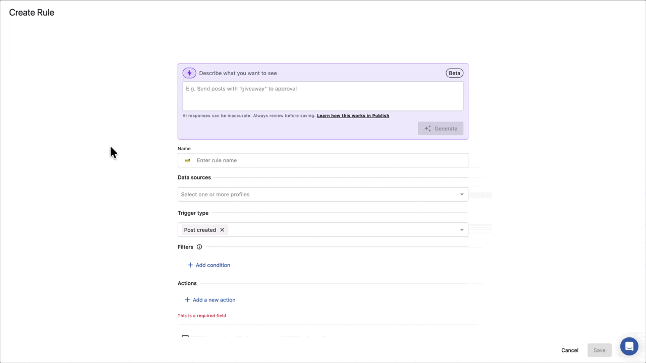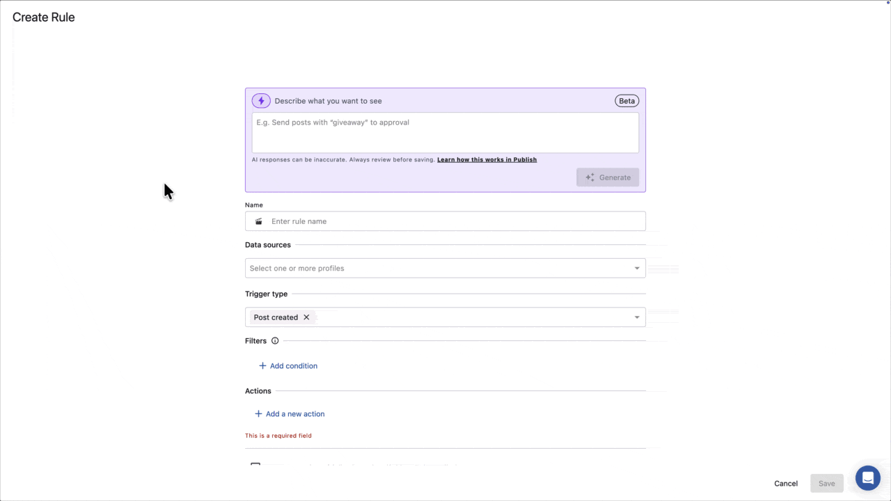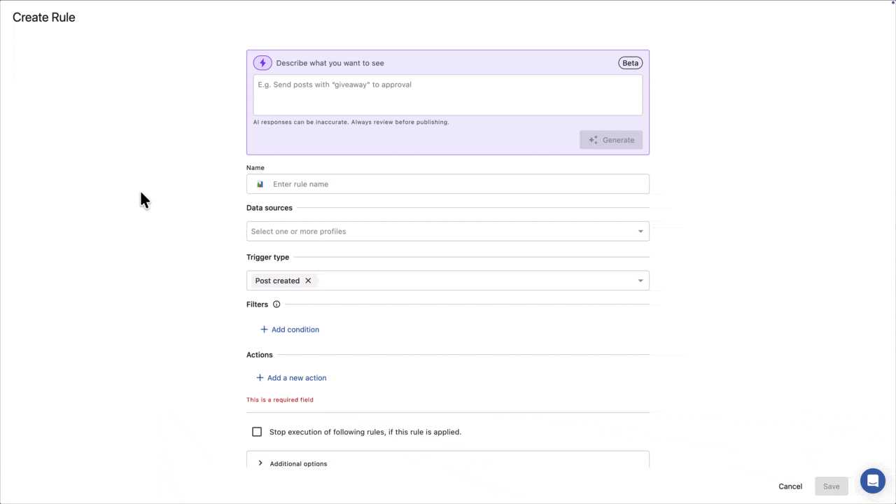 AIによる投稿監視ルールはベータ版です。大きな出発点ですが、誤りが発生する可能性もあります。そのためトリガータイプ、フィルター、データソース、アクションといった設定は保存前に必ずご確認ください。すべての項目は生成された後に編集することができます。
