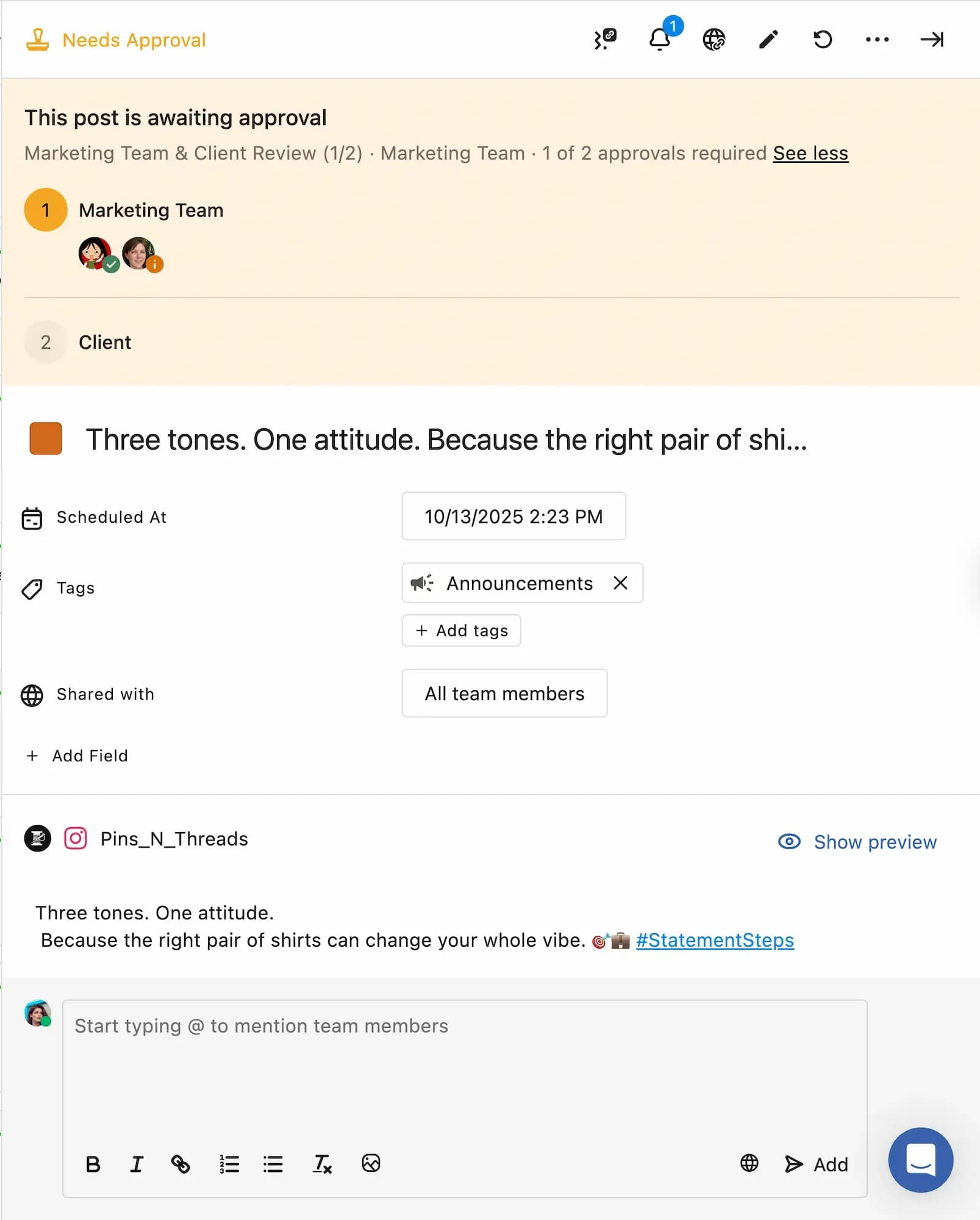 Statusbrewの承認ワークフローは、複数の承認ステップと承認者を設定することが可能です。SNSに公開されるまでの、コンテンツの承認申請 > 内容確認 > そして承認または却下という道のりがスムーズになるよう、チームの共同作業をサポートします。