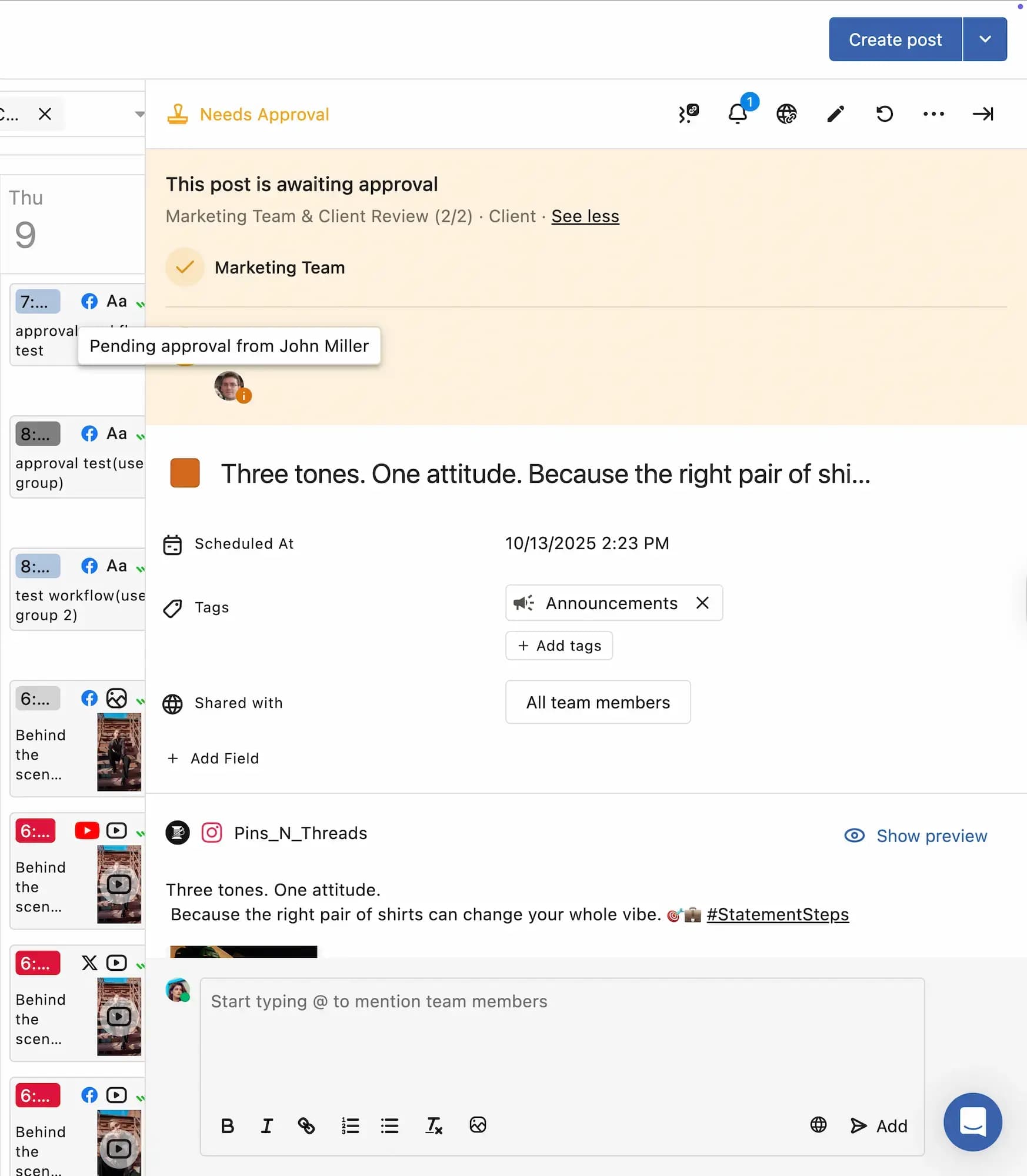 プランナーの左サイドメニューにある承認が必要というセクションでは、承認待ちの全投稿を確認することができます。