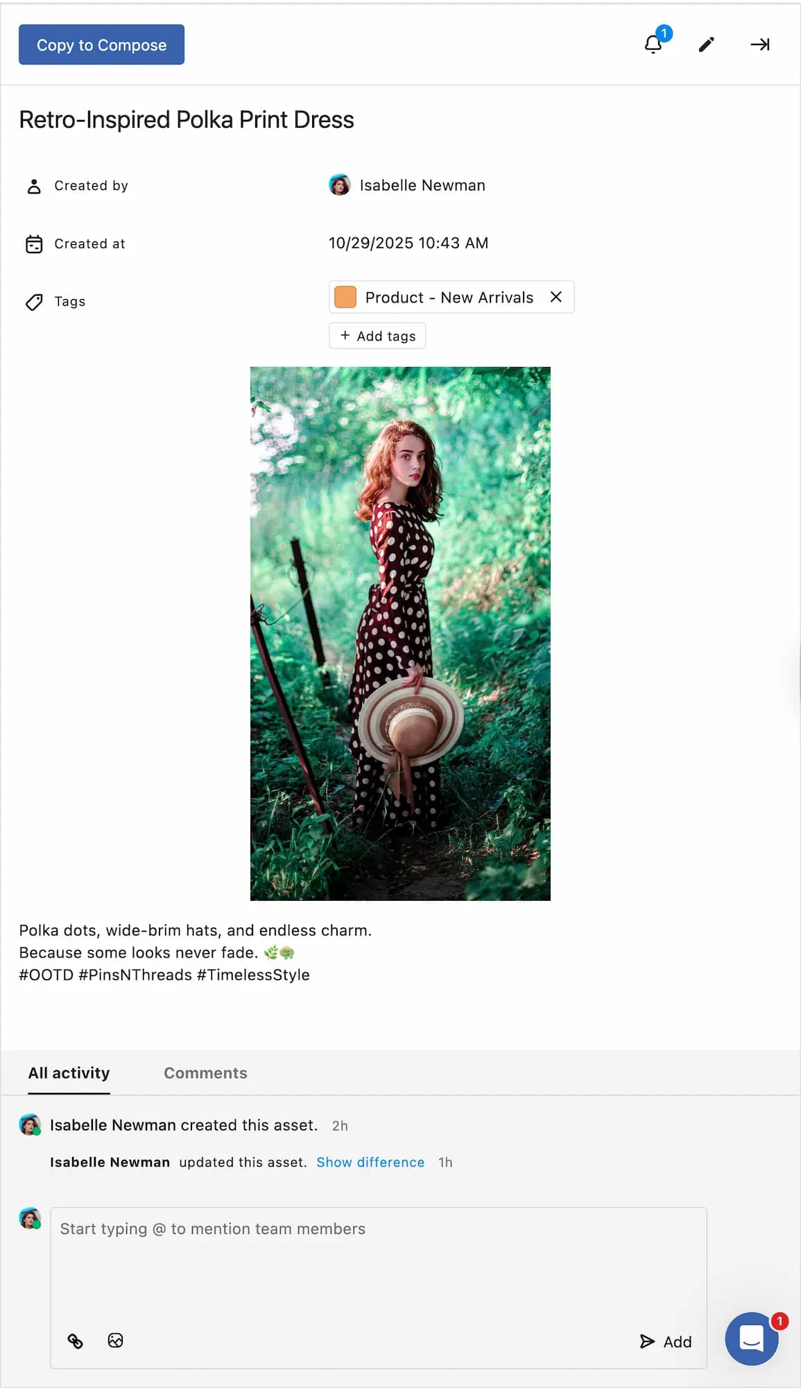 タグが付いているアセットを投稿作成時に選択すると、投稿に自動的にタグが含まれます。また、使用頻度の高いアセット(特にハッシュタグ等のテキストアセット)は、テンプレートとして使用することもできます。