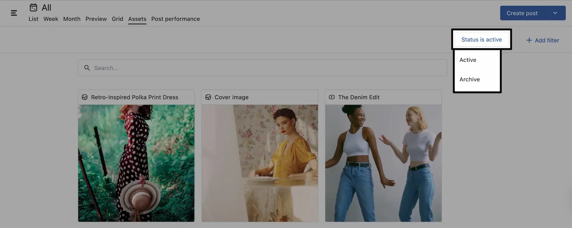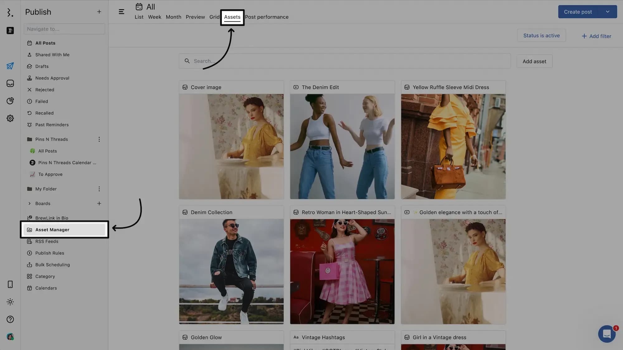 アセットマネージャーは、Statusbrewの投稿ワークフローにおける共同作業やアセット管理を簡素します。作成、管理、編集、公開をひとつのスペースで一元的に行い、視覚的な魅力あふれるSNS投稿を公開することが可能です。