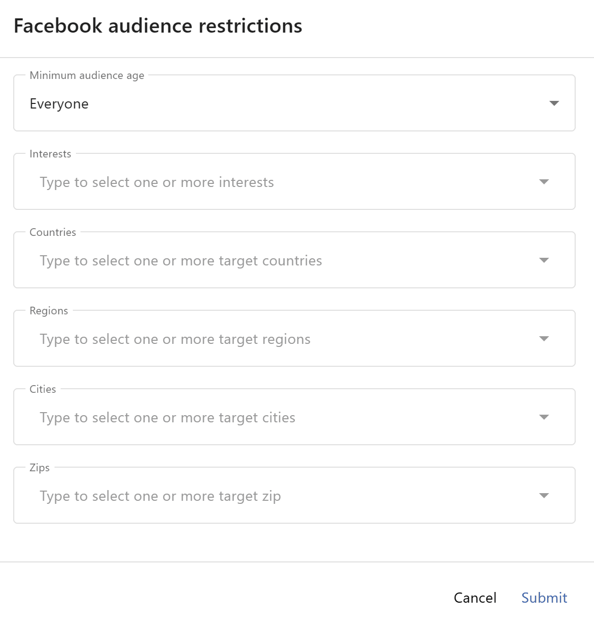 Facebookオーディエンスの制限というダイアログが開きます。ターゲットを設定してください。各項目はドロップダウンから選択します。項目によっては複数を選択することもできます。