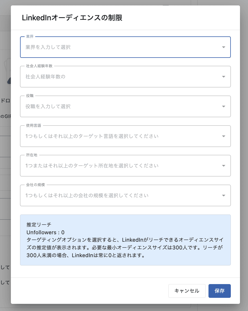 LinkedInオーディエンスの制限というダイアログが開きます。ターゲットを設定してください。各項目はドロップダウンから選択します。項目によっては複数を選択することもできます。