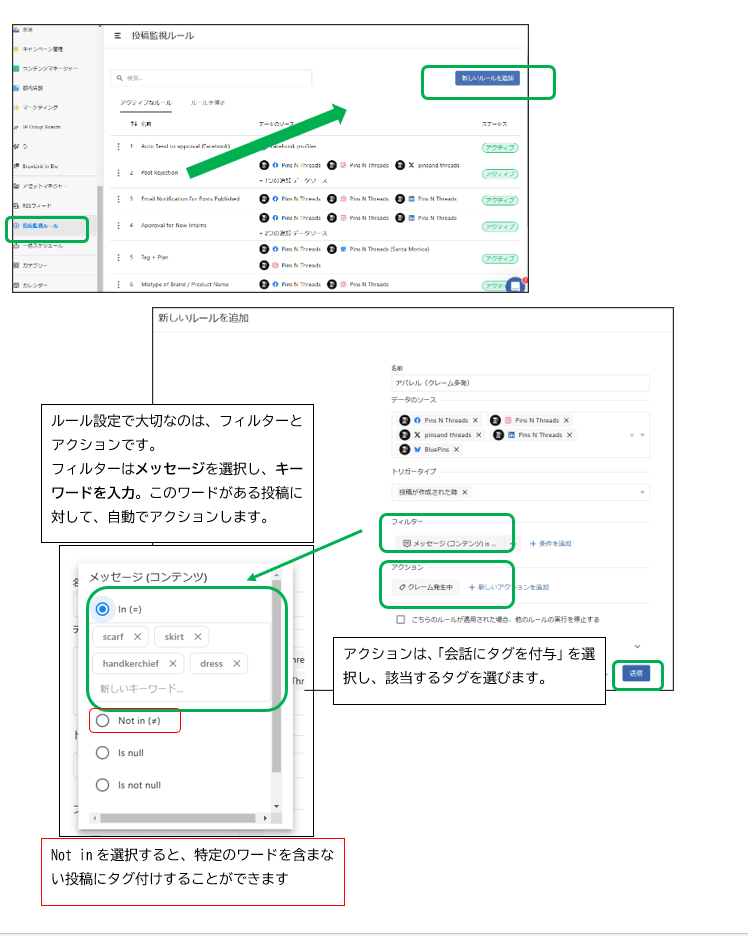 特定のキーワードを含む投稿へ自動でタグ付けを行うことによって、関連する投稿を確実に管理することができます。また、タグをつけておくと後日レポートを作成する際のフィルタリングも容易になります。