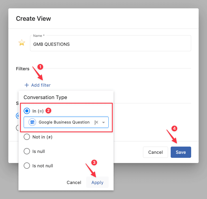 - サイドバーより、ビューの横にある+ボタンをクリックして、最適な名前、絵文字を追加して、'会話種類[[ic:li-comment]]'から'GMB評価'のフィルターを選択します。