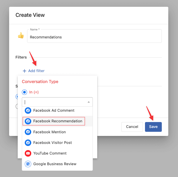 - サイドバーより、ビューの横にある+ボタンをクリックして、最適な名前、絵文字を追加して、'会話種類'から'Facebookおすすめ'のフィルターを選択します。