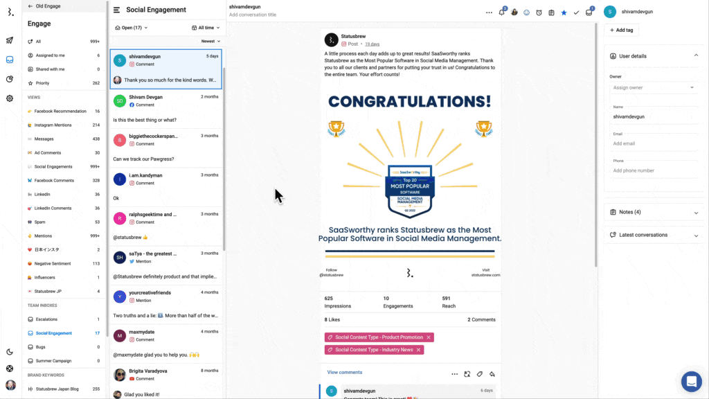 顧客があなたのブランドや製品について何を言うかはコントロールできませんが、Statusbrewを使用すると、あなたがどう返信をするかをコントロールすることができます。Statusbrewを使用して、ソーシャルメディア上のカスタマーエンゲージメントやレビューを一か所で管理することができます。一つの受信箱から、FacebookやGoogle My Businessにわたる全てのビジネス拠点のレビューを監視、管理しましょう。