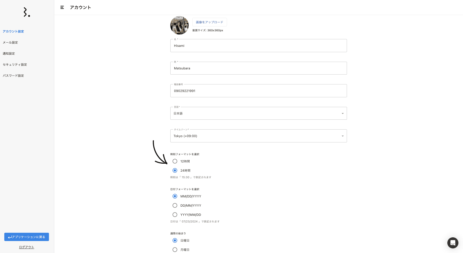 タイムゾーンを12時間(AM/PM)か24時間表記か選択ください。