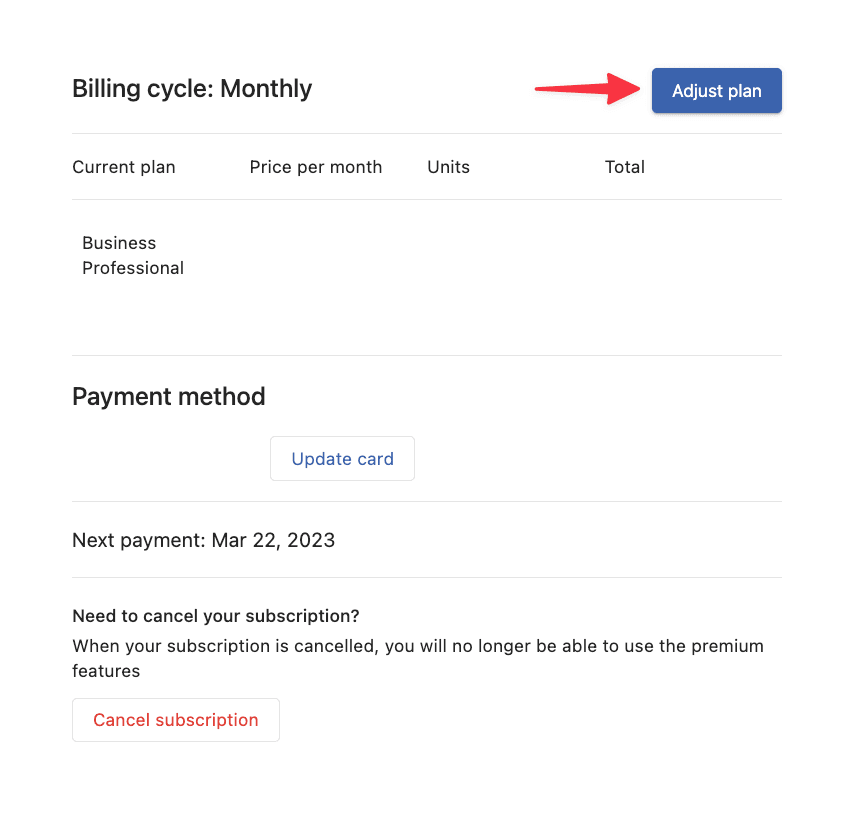 ご注意:サブスクリプションプランを高いものにアップグレードする場合、請求周期を変更することなく、現在の請求周期の残存期間については2つのプランの差額のみ請求されます。 プランを高いものから低いものに切り替えた場合、サブスクリプションの残りのクレジットは次回のサブスクリプションの支払いに引き継がれ、次の請求時に調整されます。クレジットがゼロになると、現行のプランの支払額が請求されるようになります。