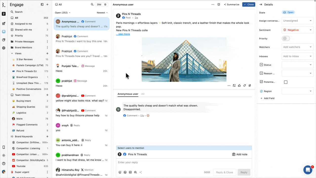 はい。エンゲージで投稿の会話を開くと、一番上に元の投稿が表示され、その下にすべてのコメントが表示されます。コメントへの返信はスレッド形式で表示されるので、アクションを起こす前に他のユーザーの反応を確認できます。