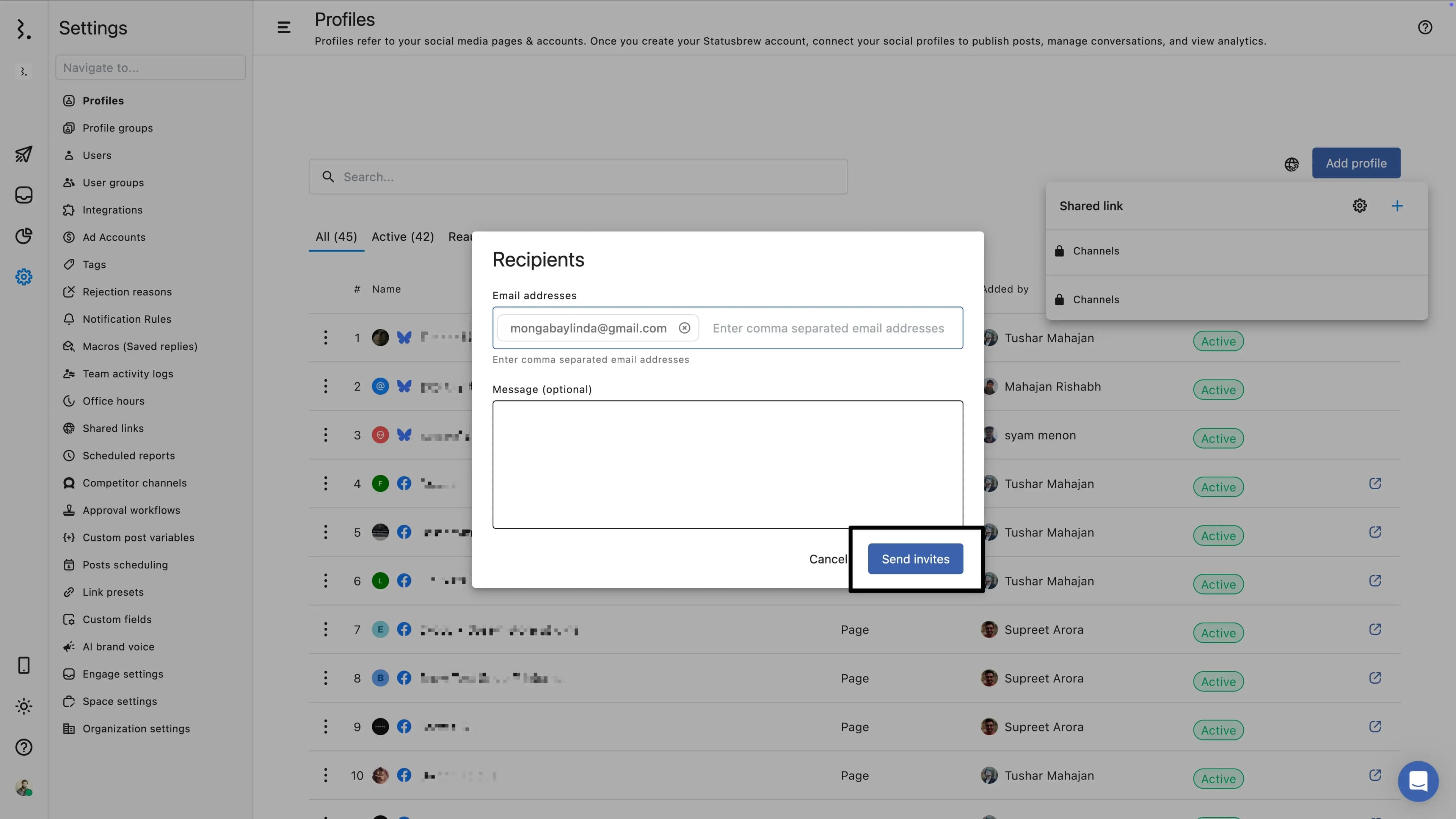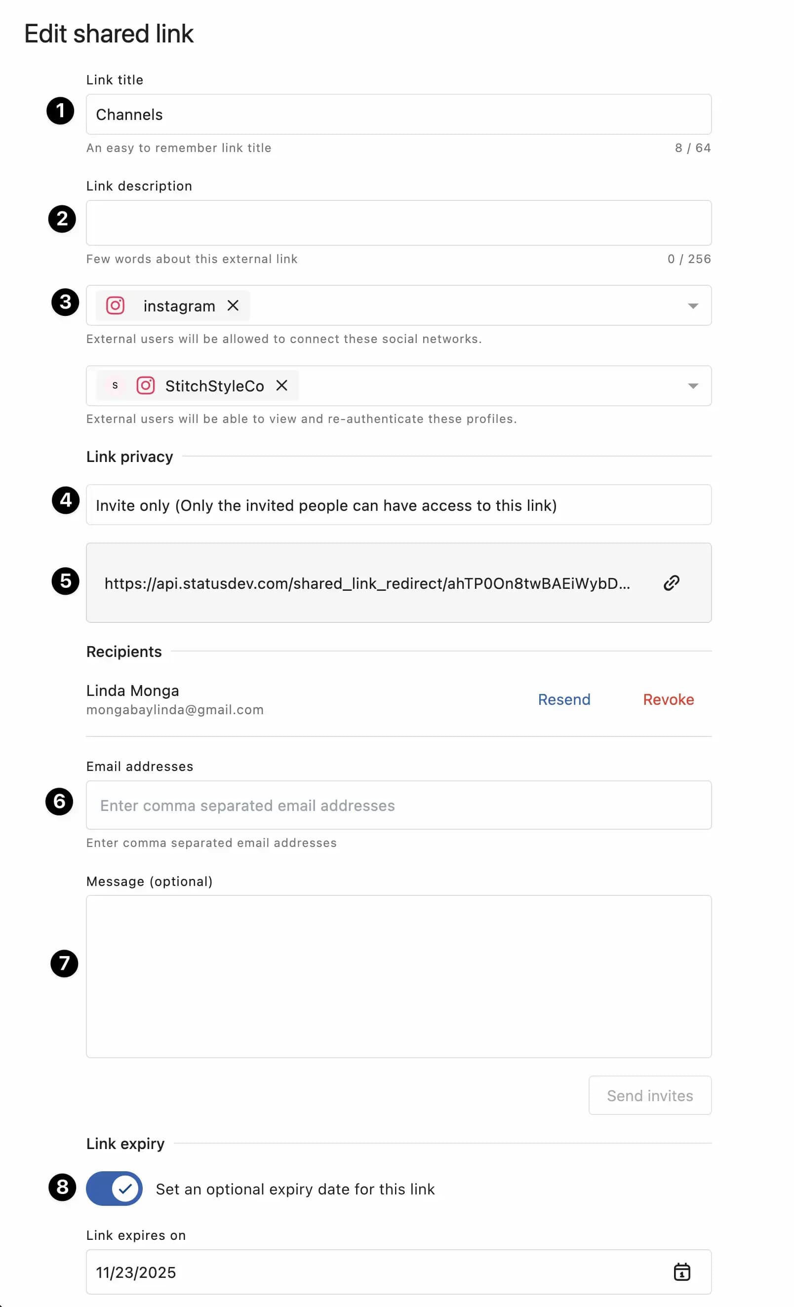 共有リンクとは、Statusbrewの組織外のユーザーがソーシャルプロファイルを接続/認証できる発行URLです。あなたが接続を許可するネットワークを選択し、外部ユーザーのメールアドレスを追加し、必要であればリンクの有効期限を設定します。外部ユーザーが招待を受け取ると、ソーシャルネットワークへ直接接続し、認証が完了したプロファイルは即座にあなたのStatusbrewスペースに表示されます。