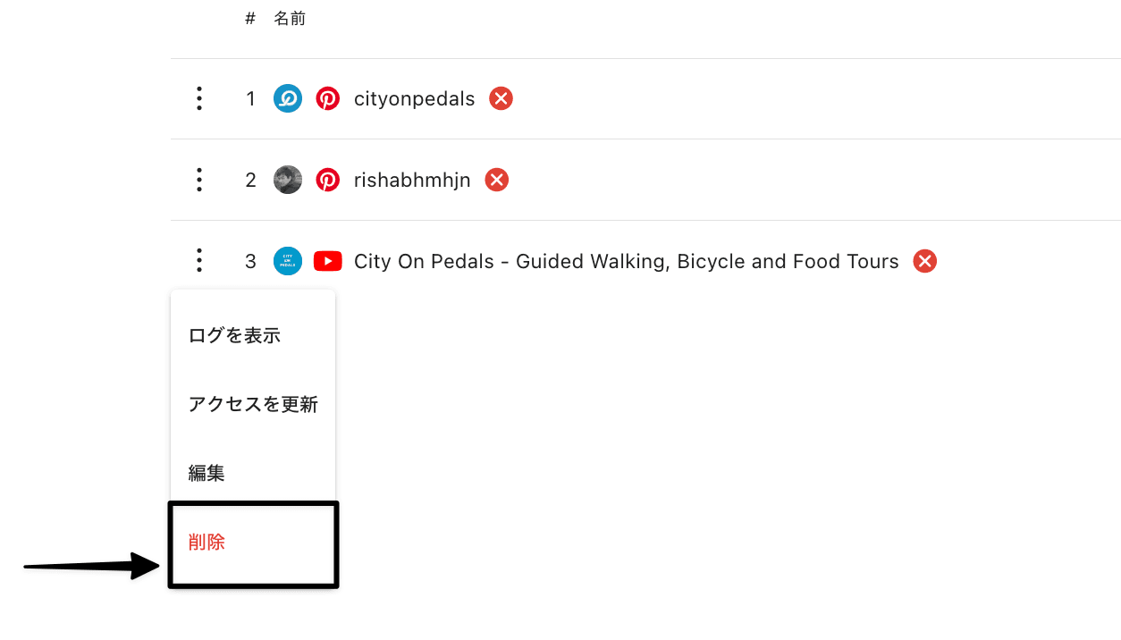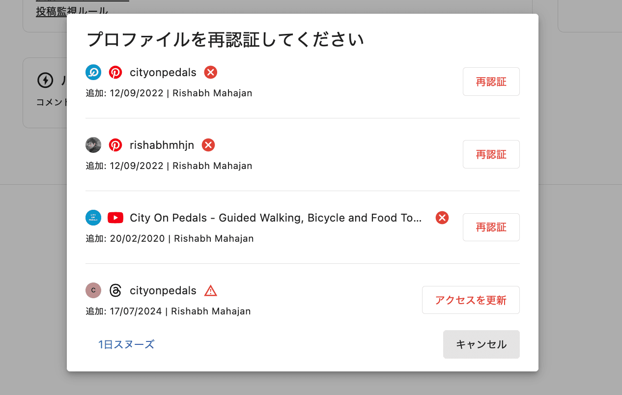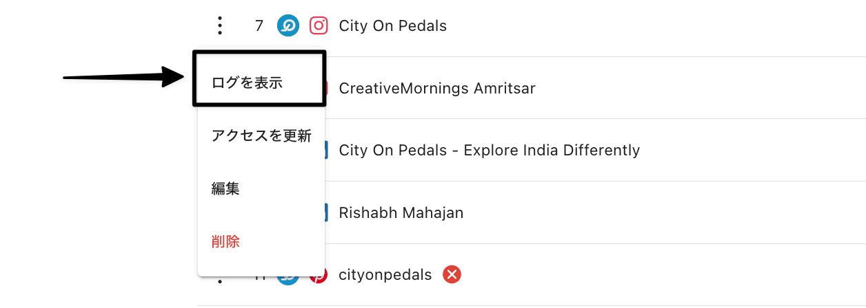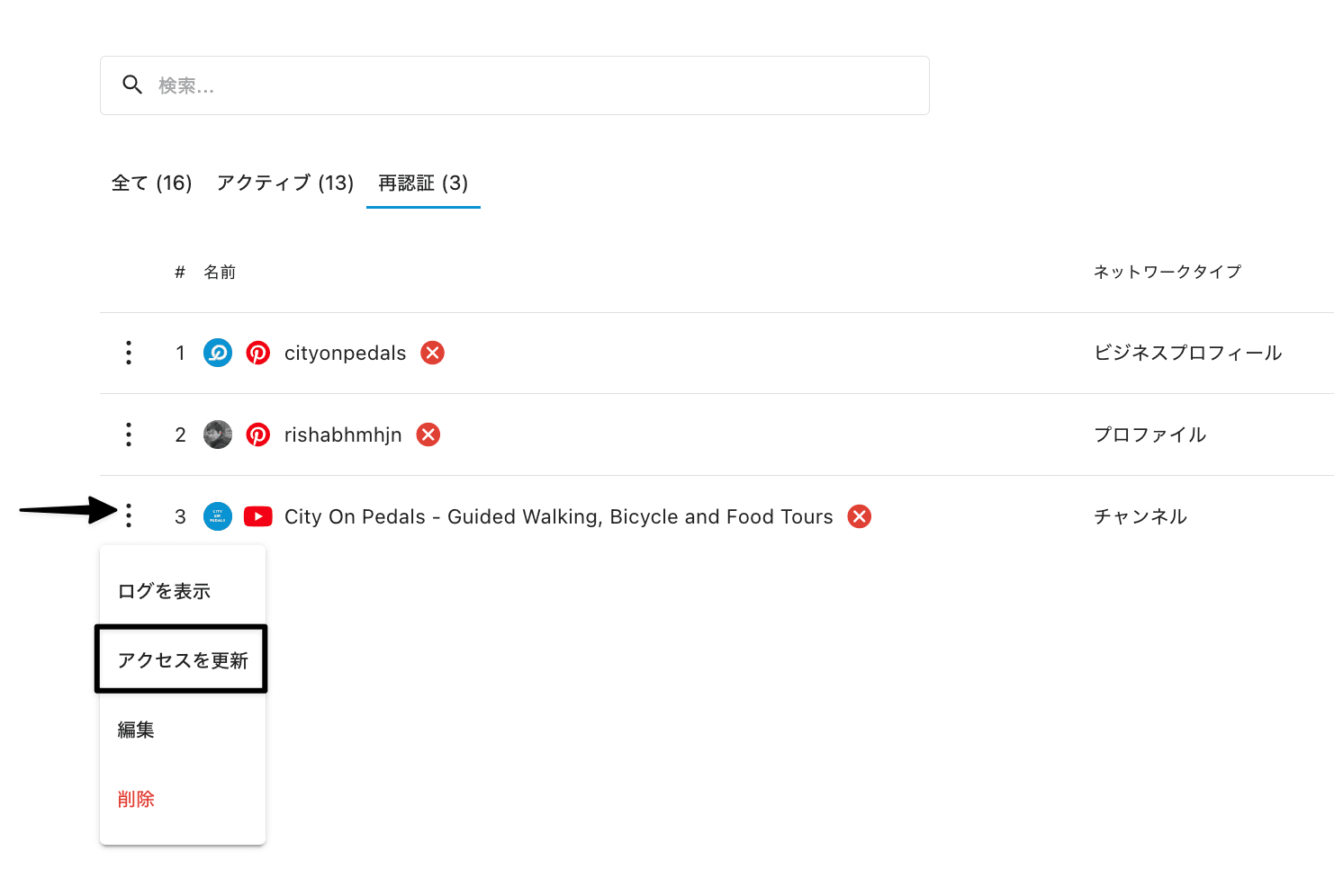 トークンの有効期限が切れる前にアクセスを更新してしまいたい場合は、ソーシャルプロファイルの横にある3つのドットメニューをクリックし、アクセスを更新をクリックして、手動でプロファイルを再認証することができます。