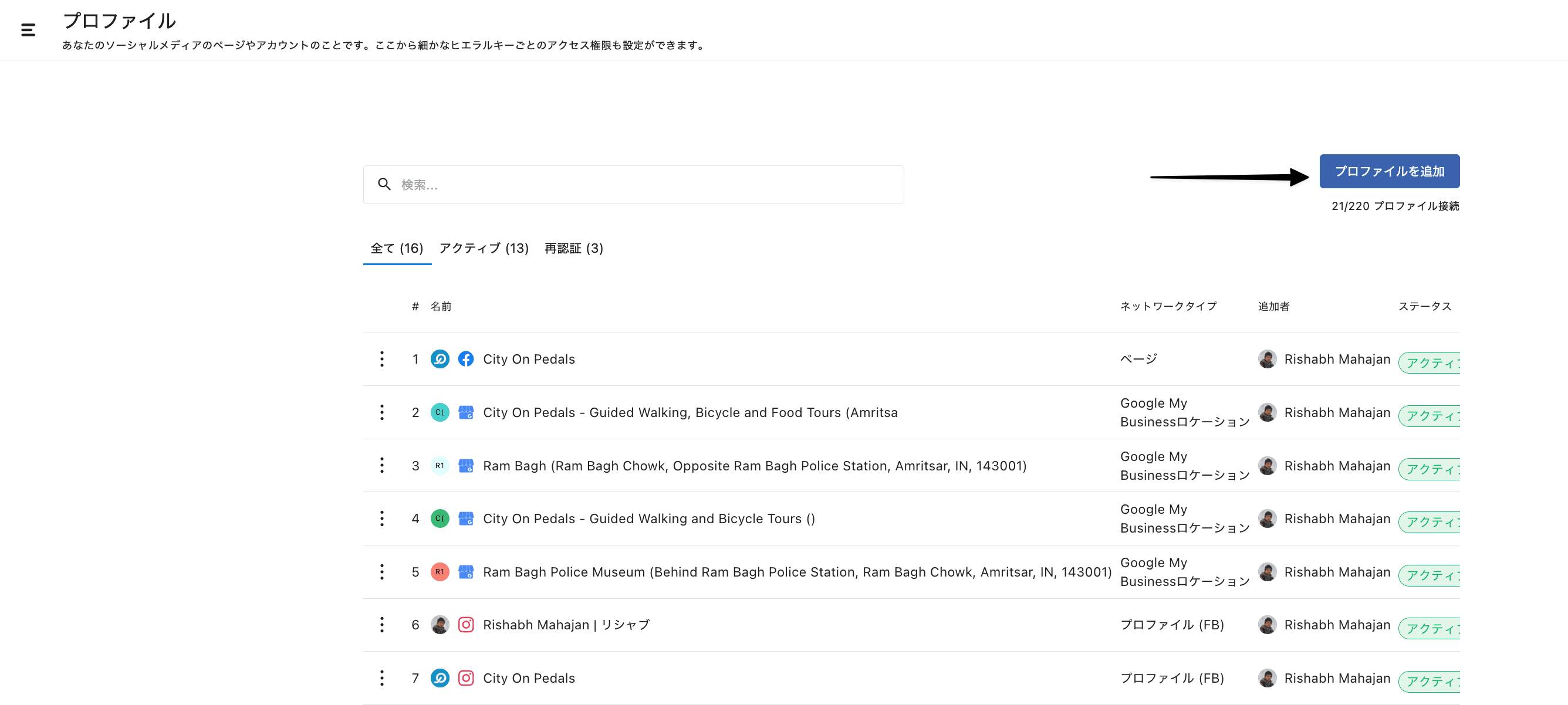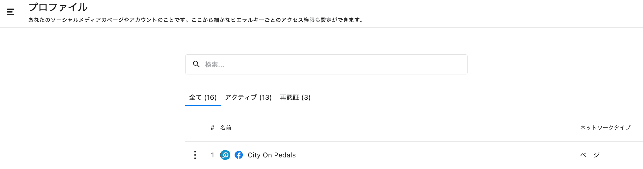 開くとこれまでにStatusbrewに接続されたソーシャルプロファイルのリストが表示されます。リストは全て、アクティブ、再認証が必要なプロファイルの3つに別れています。