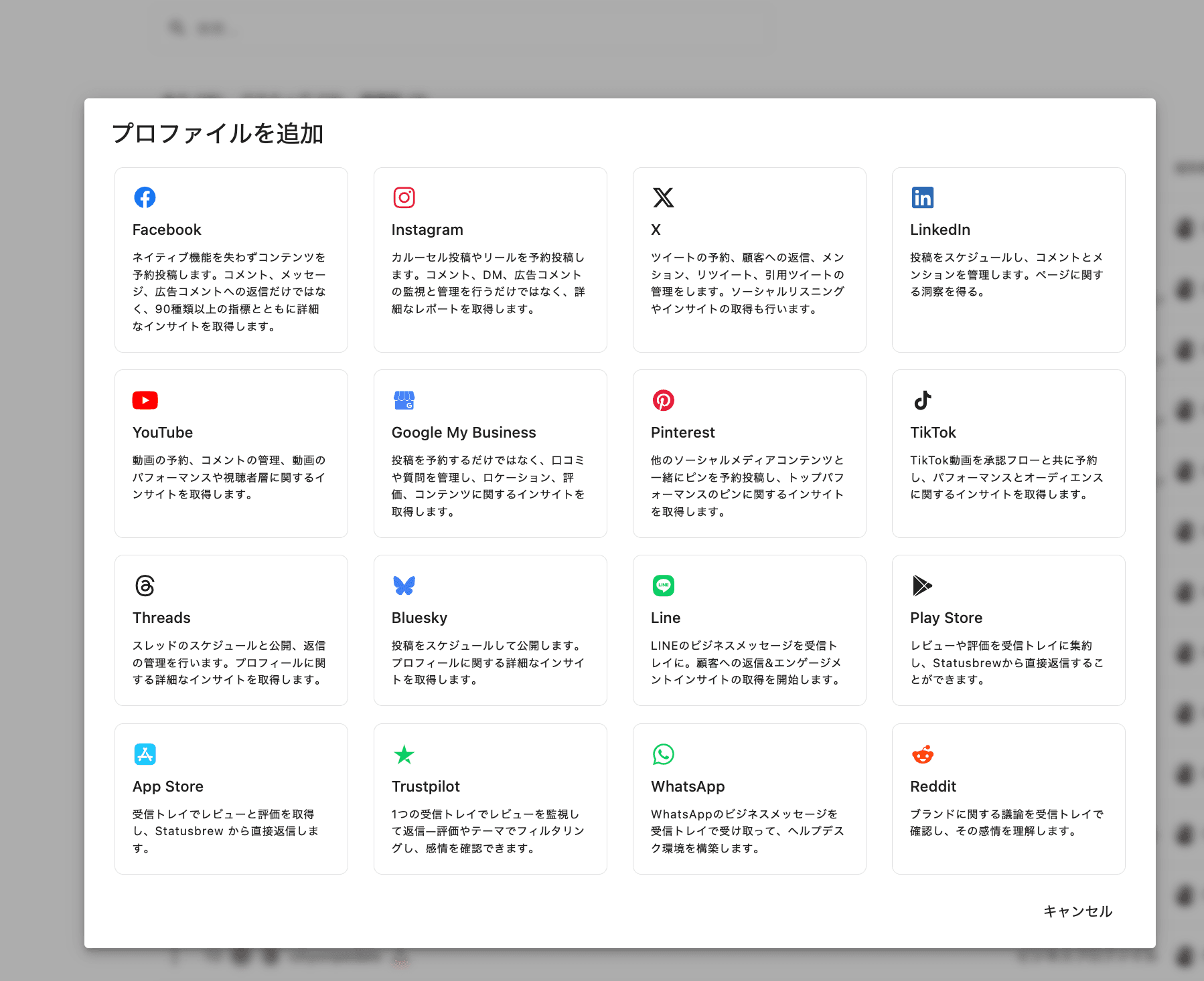 現在、Statusbrewは以下のソーシャルネットワークと統合しています - X(Twitter)、Instagram、Facebook、TikTok、LinkedIn、Googleビジネスプロフィール(旧名: Googleマイビジネス )、YouTube、Pinterest、Threads、Bluesky、Play Store、App Store、WhatsApp、Reddit、Trustpilot、LINEです。各ソーシャルネットワークに固有の以下のプロファイルタイプをStatusbrewと連携させることができます:
