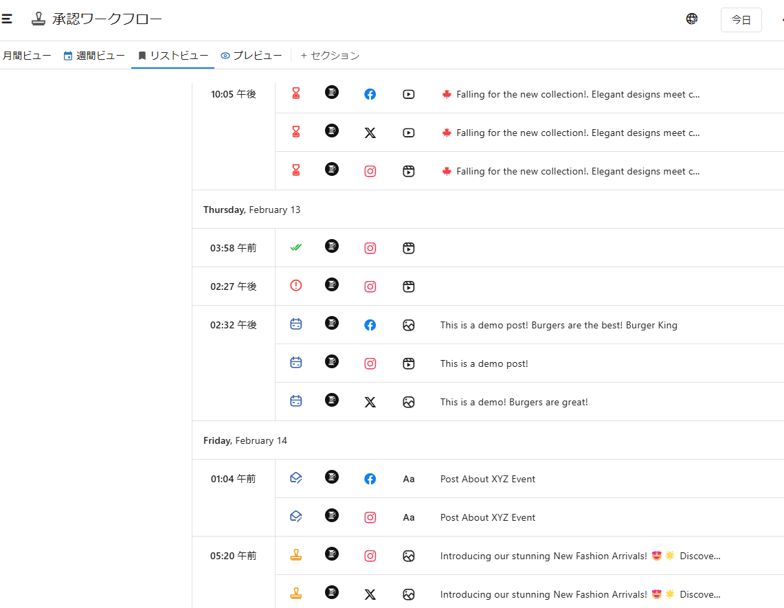 一週間のカレンダータイプです。選択した週のコンテンツが日ごとに表示され、簡単にコンテンツを特定することができます。月間ビューと同じく、サムネイルをクリックすると詳細が表示され、編集や削除ができます。コンテンツを別日にドラッグ&ドロップすれば、予約日時の変更も可能です。