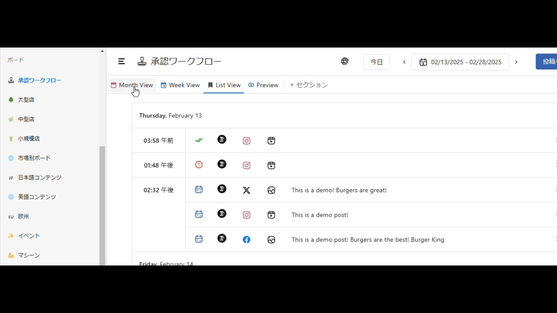 すべての投稿では上のバーにデフォルトで、月間、週間、リスト、グリッドの各ビューに切り替えが可能です。プランナーボードの場合は、新規のボードを作成すると、デフォルトWeek View、Monthly View、List View、 Previewのセクションが作成されます。