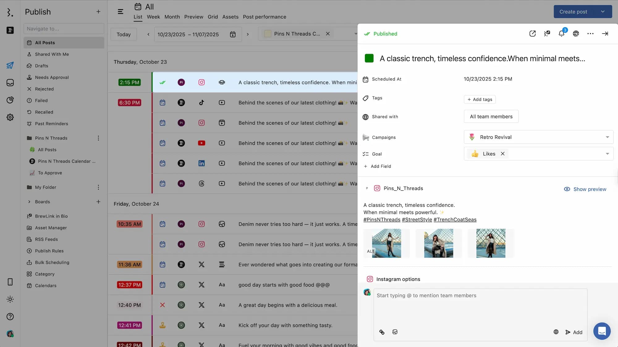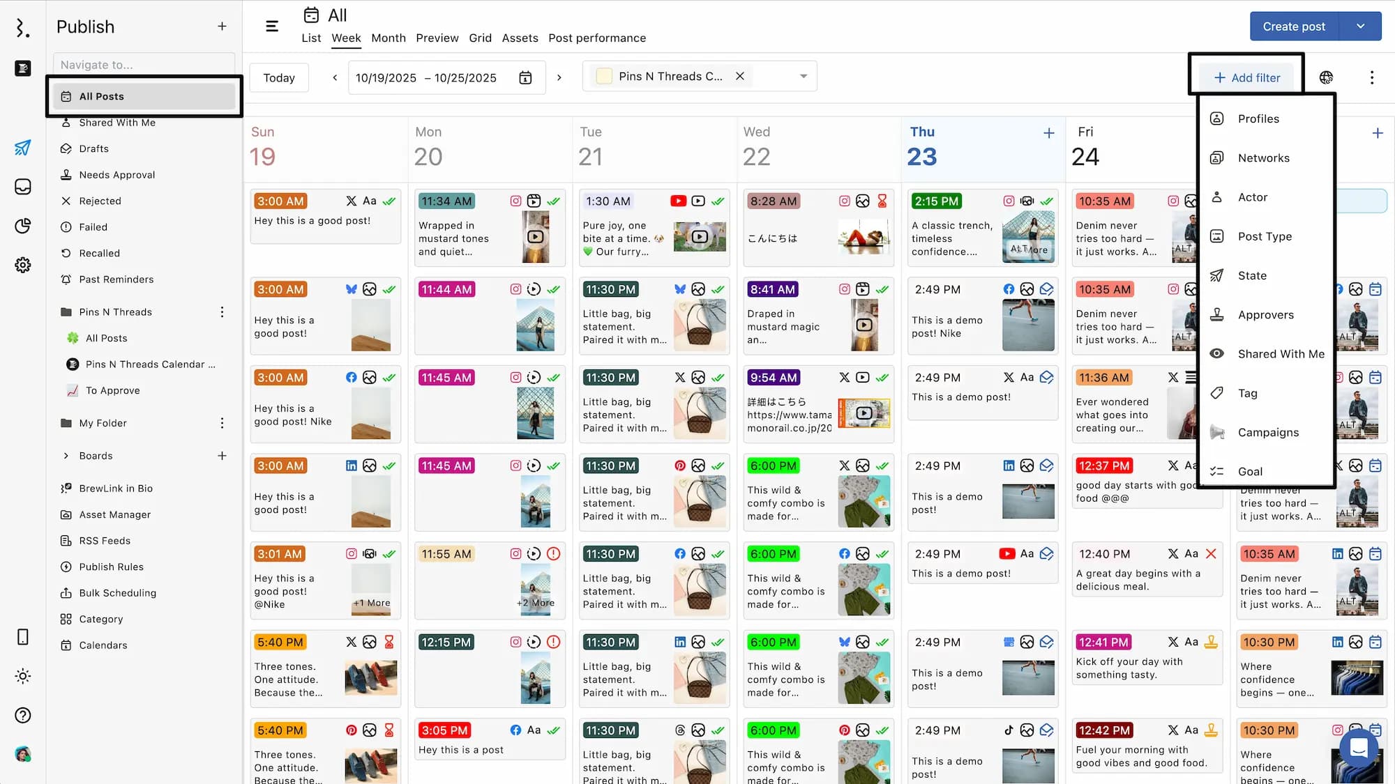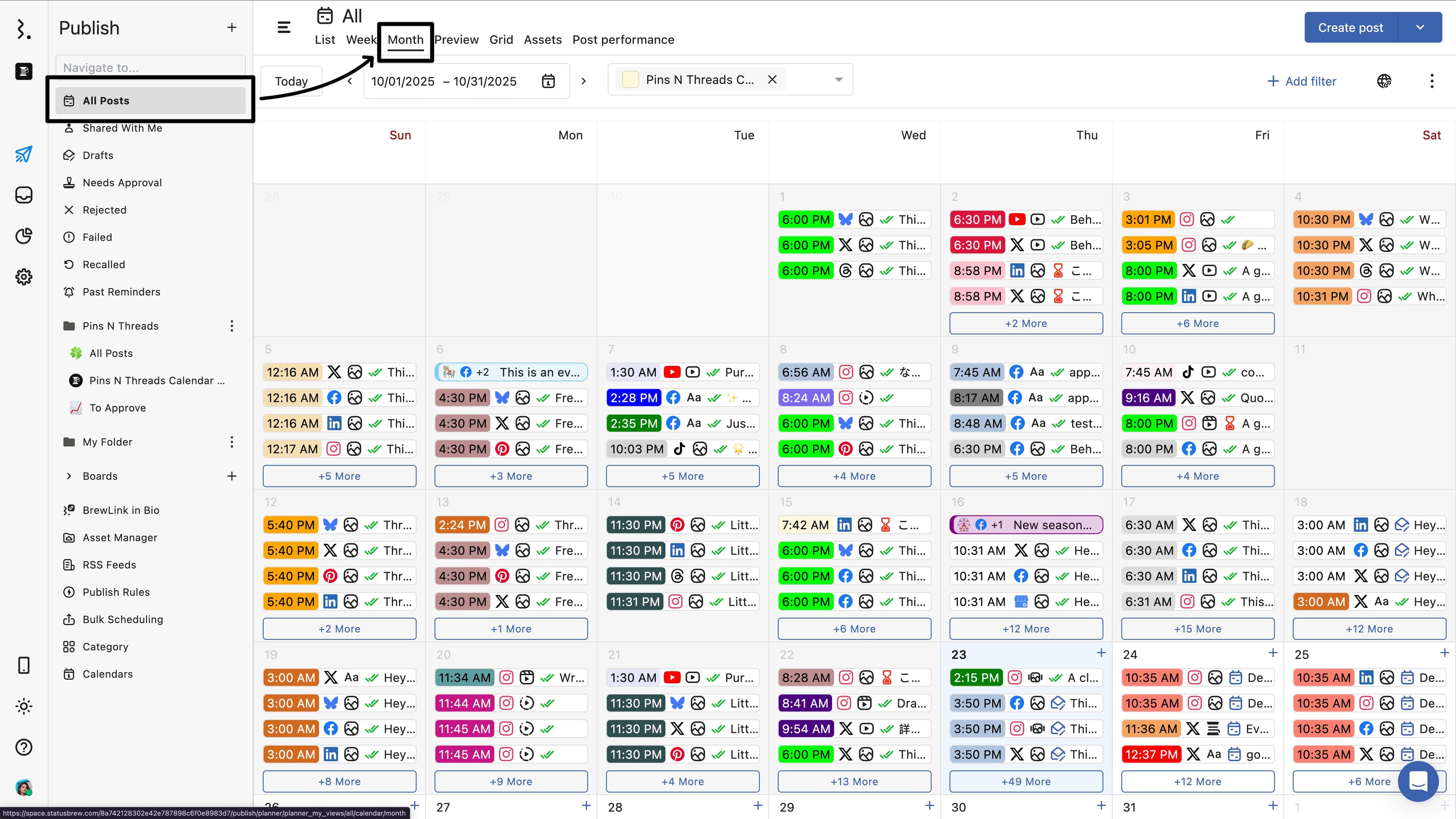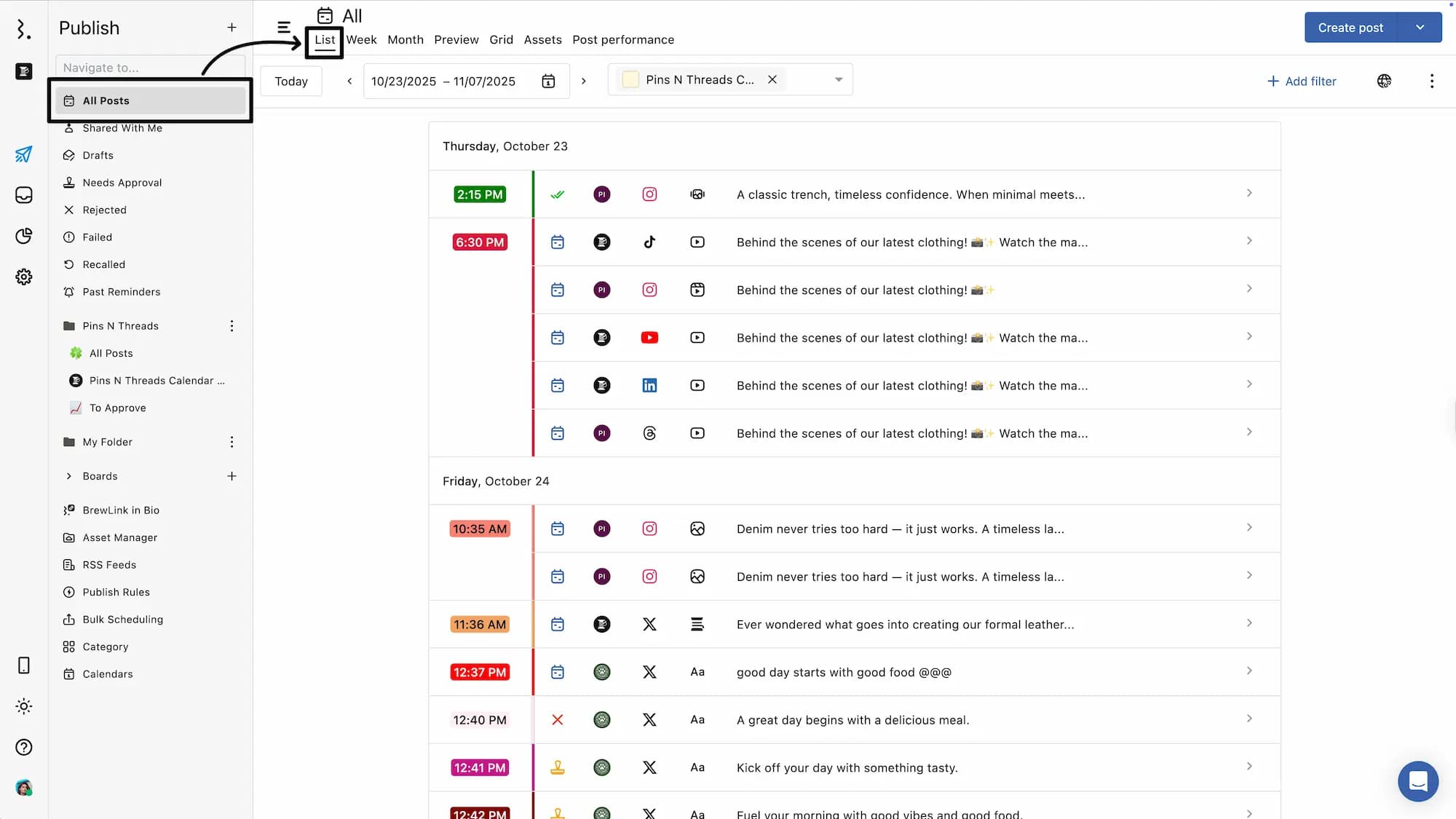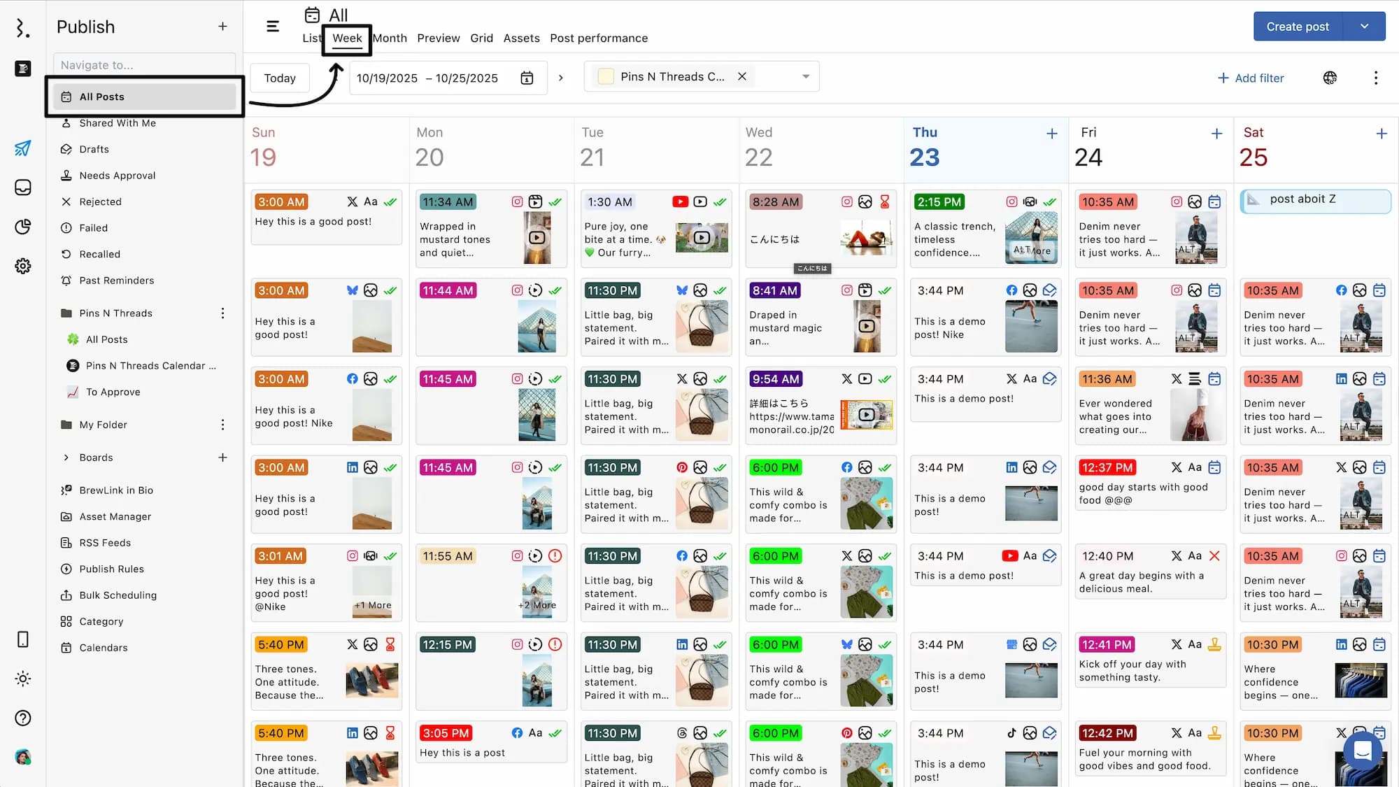 リストビュー、週間ビュー、月間ビューで投稿にアクセスするには、サイドバーの プランナー > すべての投稿をクリックします。トップバーのタブを切り替えてレイアウトを変更します。