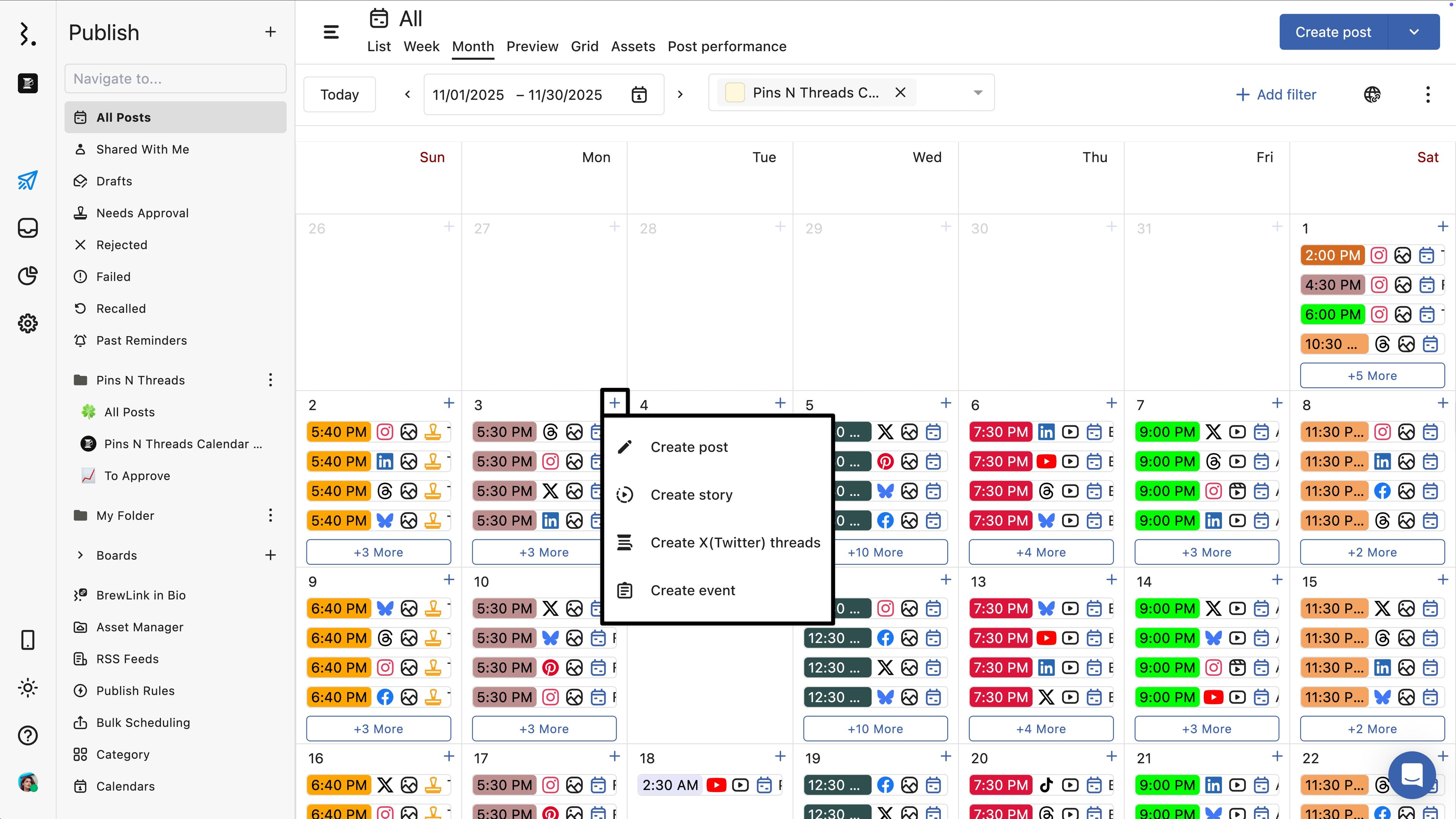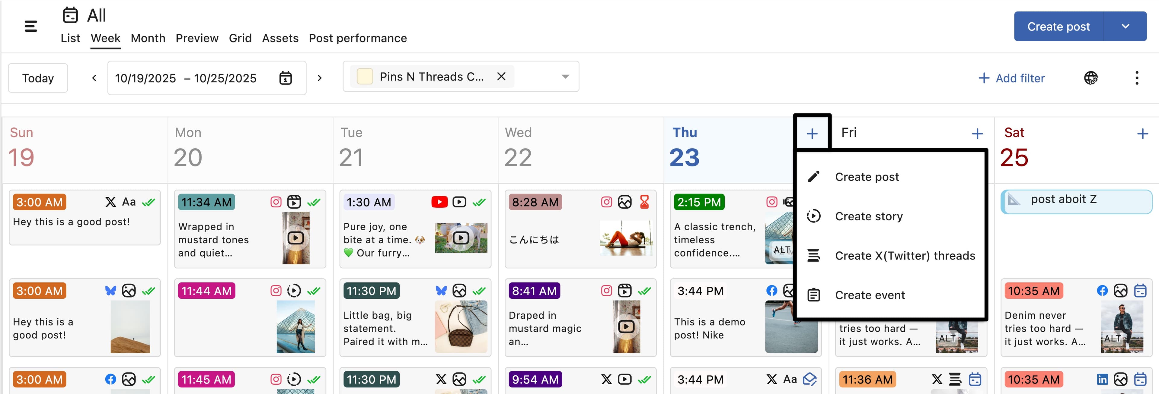各日付の右にある 投稿を作成アイコンをクリックすると、投稿を作成、 ストーリーズを作成、 X(Twitter)スレッド作成, イベントを作成のオプションを選択することができます。