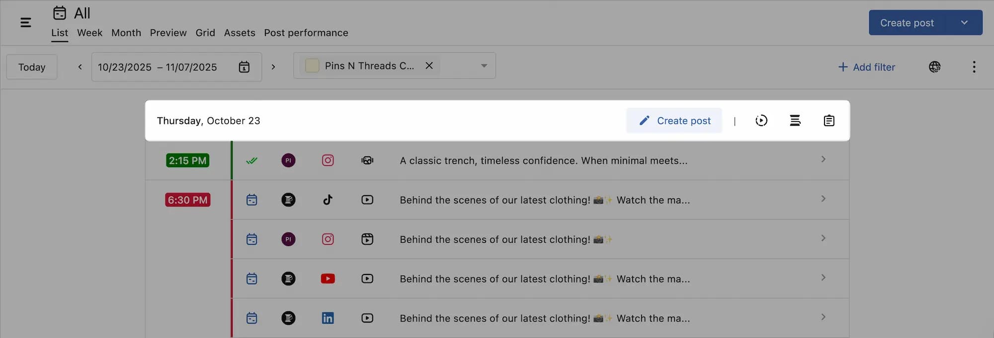 時系列で、各日の下に投稿が表示されます。同一日内の投稿は、時間が速い順に並びます(例:1:00 AM、12:00 PM、 11:30 PM)。全日イベントの場合は、日付のすぐ下に表示されます。