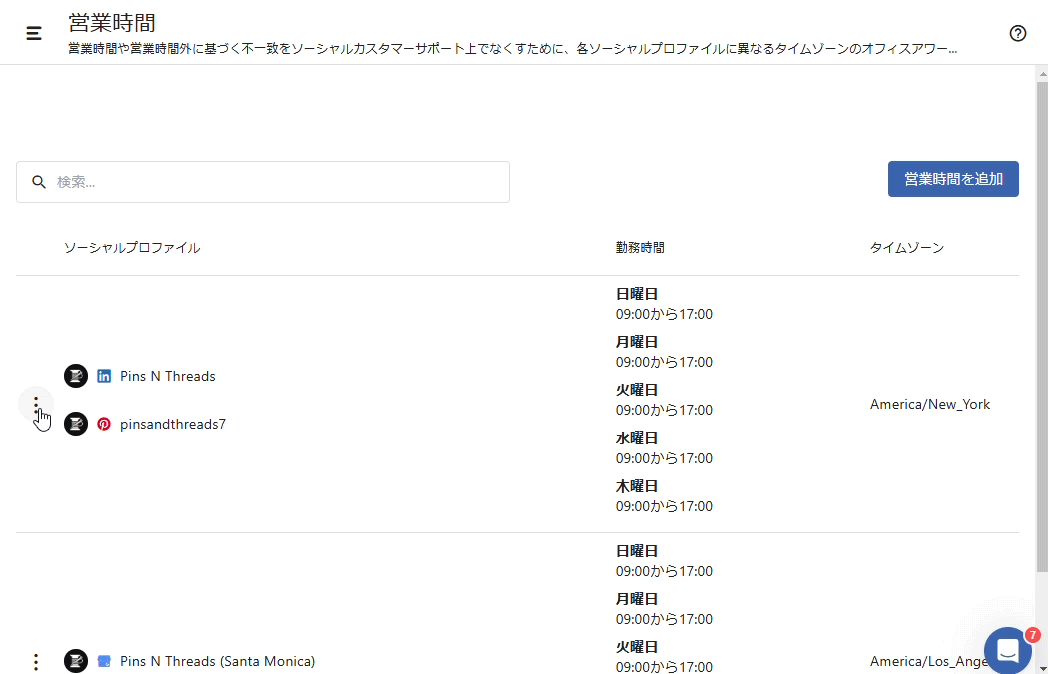 右上の「営業時間を追加」ボタンをクリックし、希望するソーシャルプロファイル(複数も可能)とタイムゾーンを選択します。
