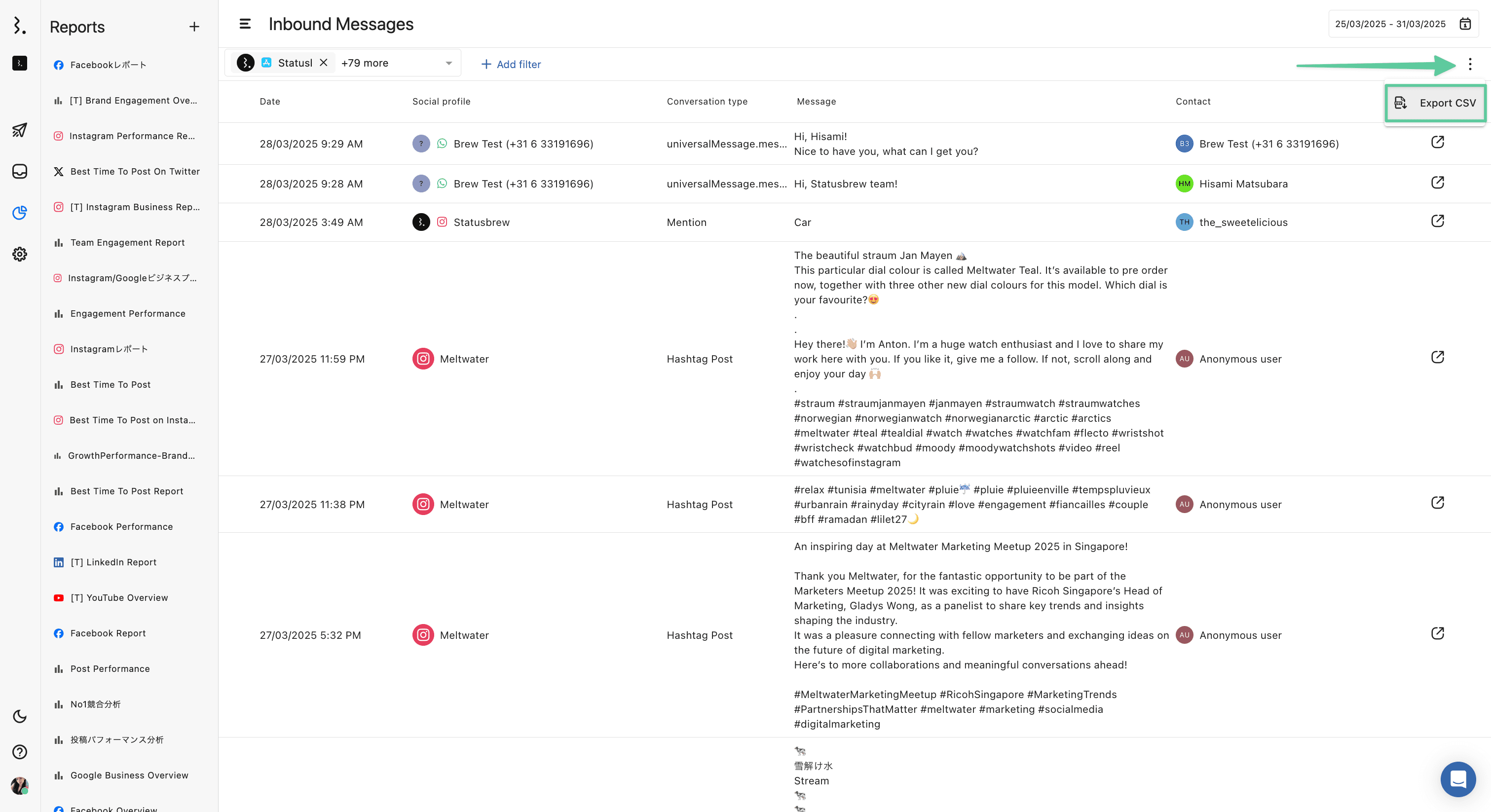 エンゲージのインバウンドメッセージレポートでは、インバウンドの会話をリスト形式で見ることができます。このリストは、CSV(エクセル)ファイル形式でダウンロードできます。
