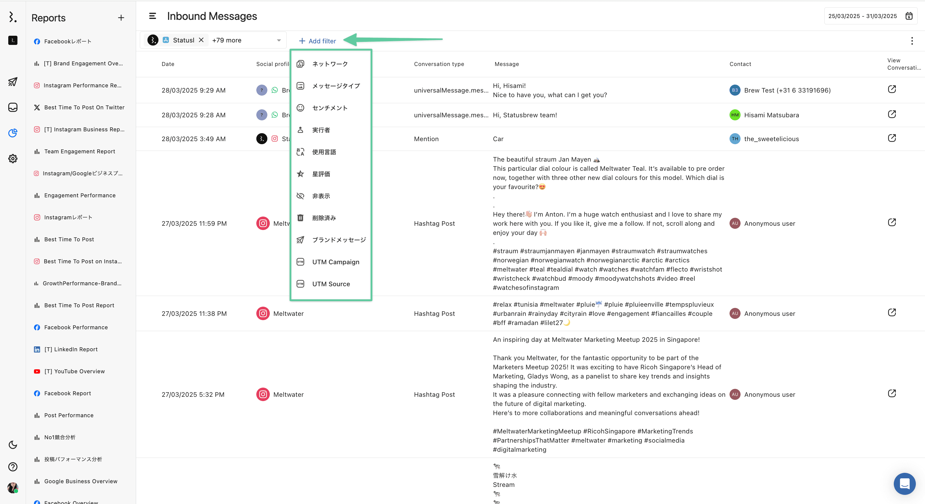 特定のデータソースや会話の種類、言語などに関するコメントだけを抽出したいという場合には、下記の手順でデータソースを選択したり、フィルターを追加しりすることが可能です。