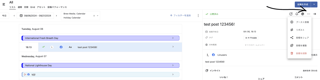 2.公開済みのFacebookの投稿をクリックし、プランナーのリストやカレンダービューから詳細を開きます。