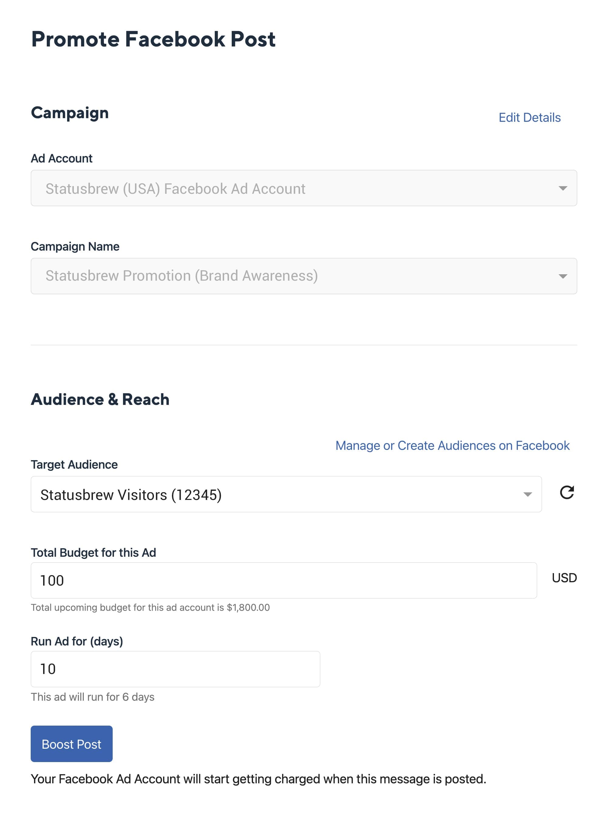 Statusbrew内から直接あなたの投稿を簡単に宣伝することができ、新しいオーディエンスを獲得することやブランド認知度上げることができます。Facebookの投稿はStatusbrewのコンポーズウィンドウ、プランナーリスト、カレンダービューから直接宣伝できます。