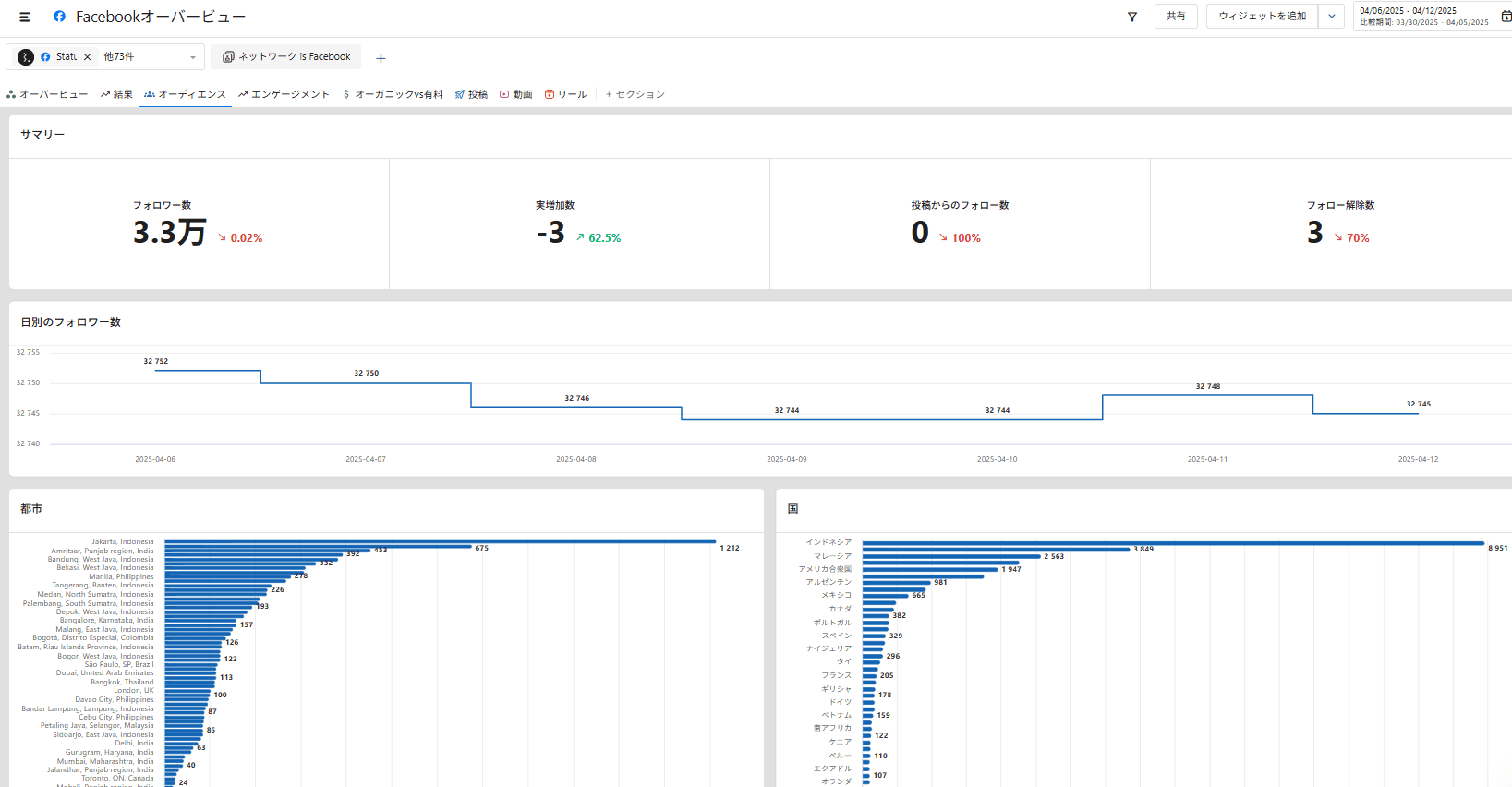 Facebookに関するアクティビティを、オーディエンス、エンゲージメント、投稿など基本的な要素から、Facebook特有である有料配信とオーガニックのリーチ数の比較まで、広く分析することができるのがこのレポートです。