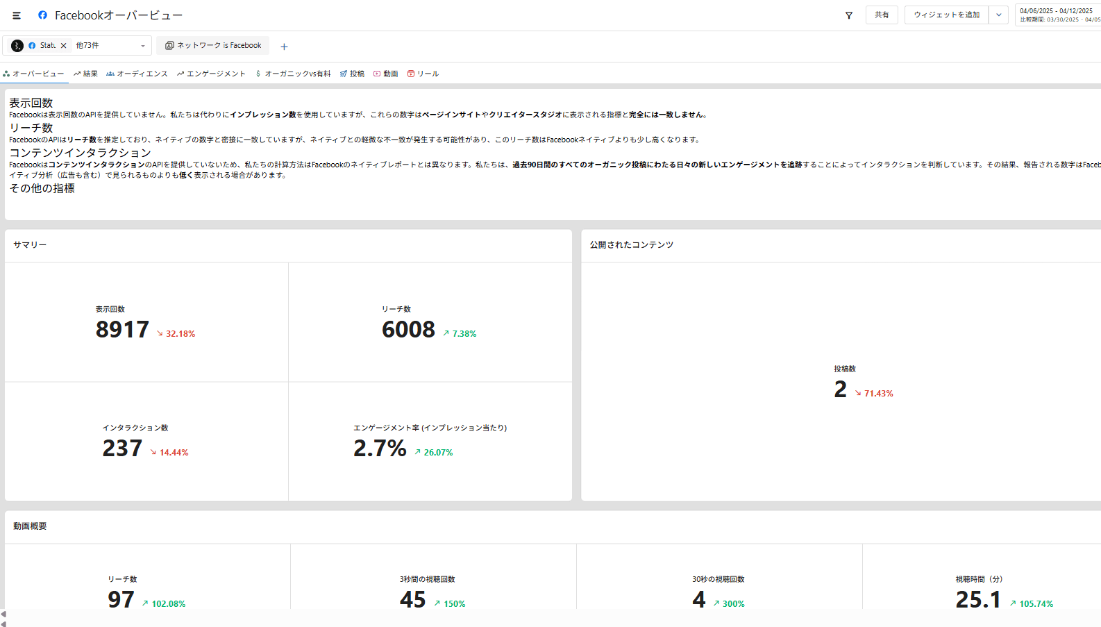 Facebook動画投稿:各投稿の表示回数、リーチ数、エンゲージメント数などを表示