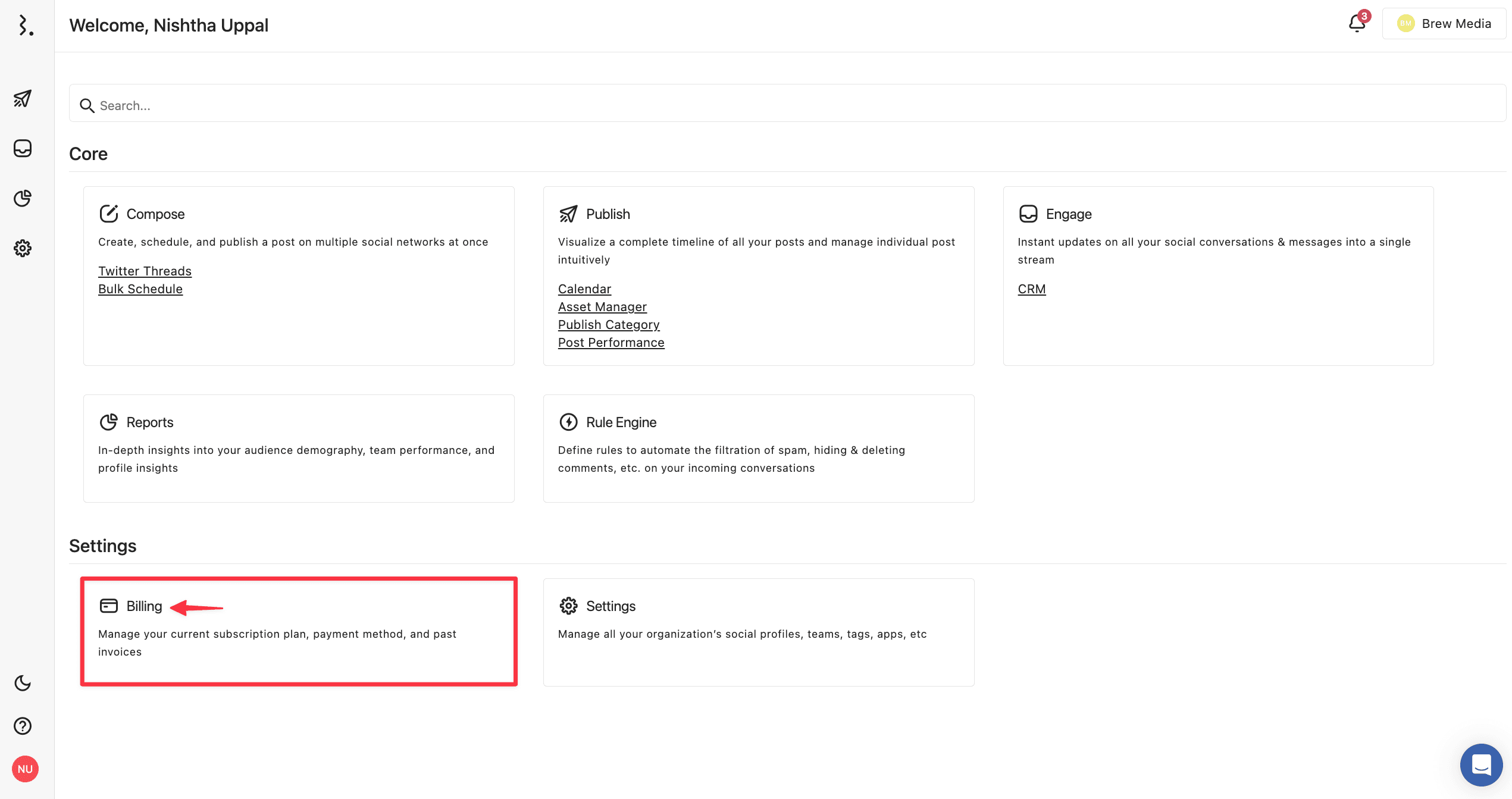 Statusbrewホームから請求に移動します。(プライマリーオーナーのみが請求ページにアクセスできます)
