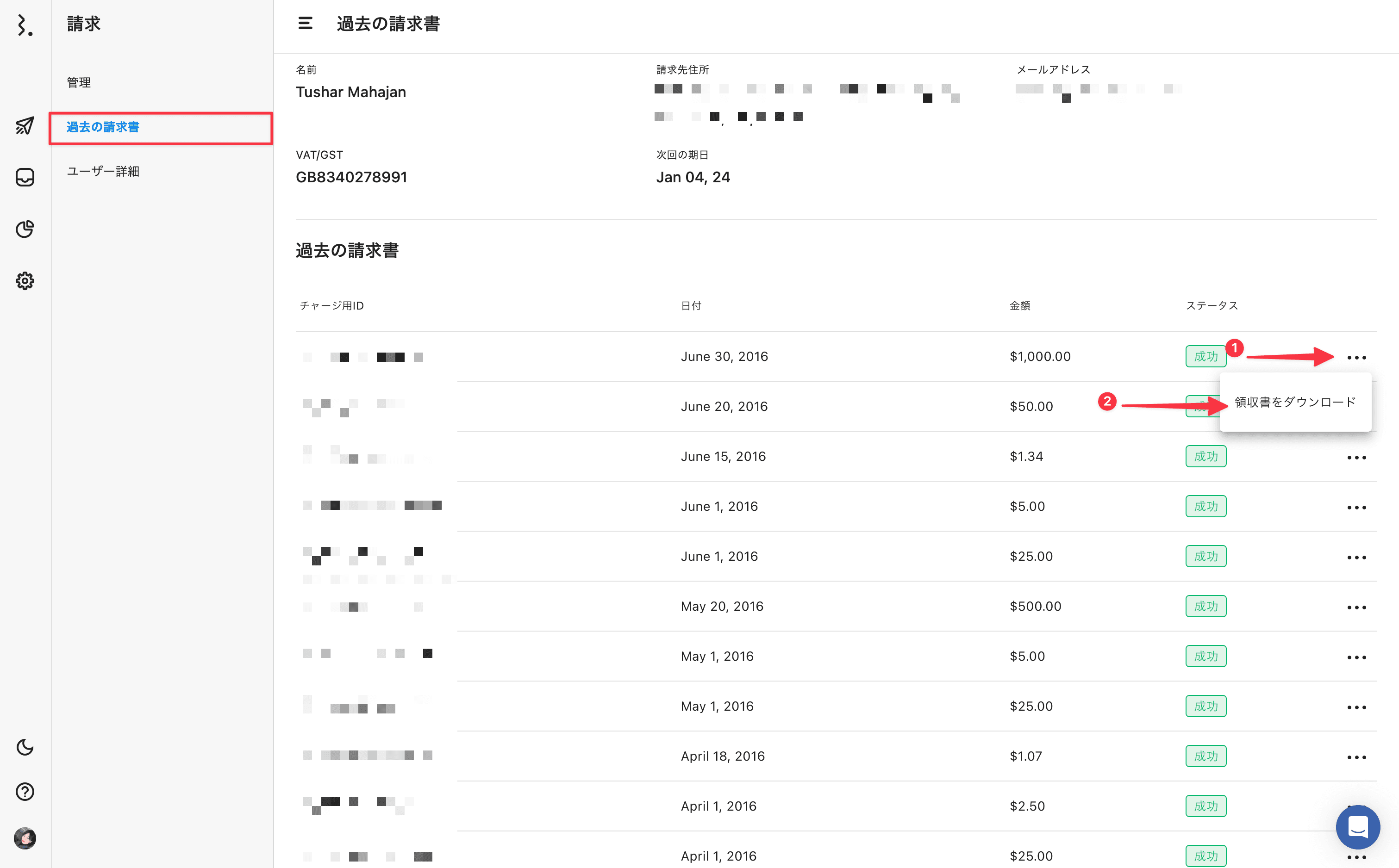 中央画面でこれまでに購入履歴と請求書が一覧表示されます。3点ドットメニューをクリックすると領収書をダウンロードできます。