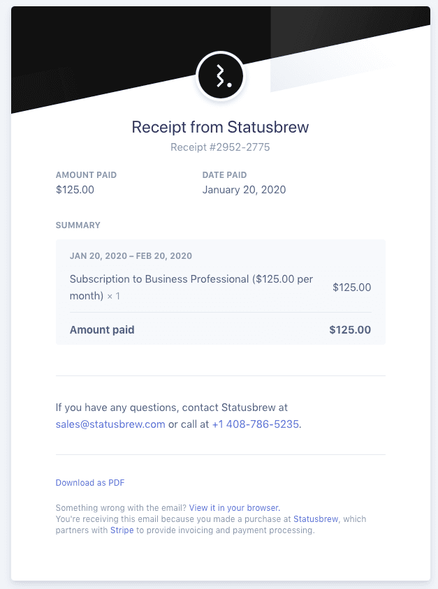 Statusbrewはクレジットカードによるサブスクリプション購入履歴を全て記録し、チャージID・日付、合計請求額含むインボイスを発行します。