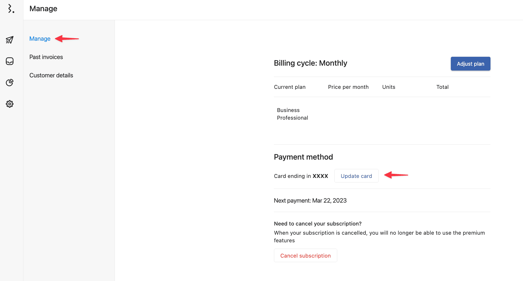 左側のナビゲーションから管理を選択し、支払い内容の詳細欄からカード情報の更新をクリックします。