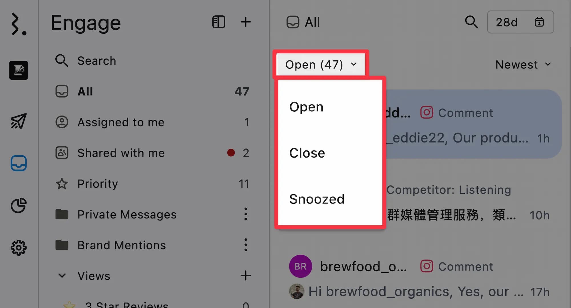 複数のSNSから大量の会話に対応するのは、各会話を受信箱へ移動させて整理整頓するという、骨の折れる作業です。時間も消費してしまいます。Statusbrewでは、生産性を落とすことなく、過度な時間や労力を使わずに、会話を効率的に分類する機能を提供しています。