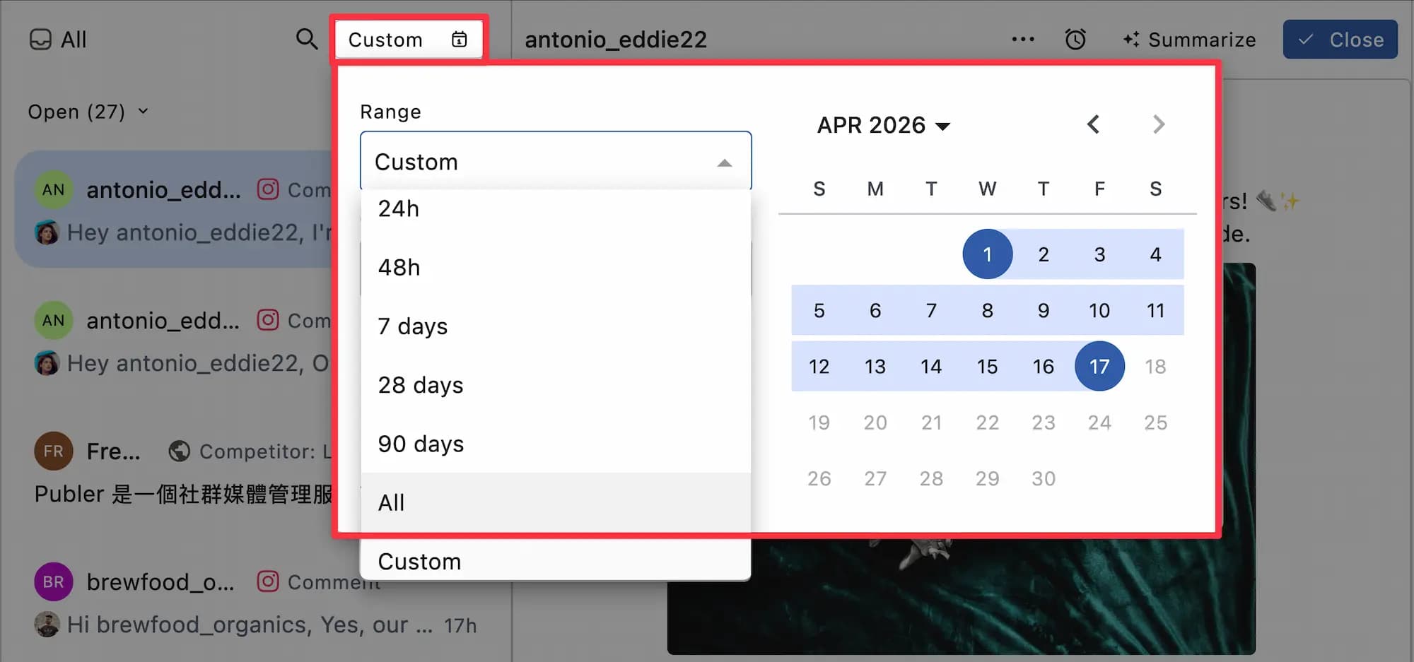 日付範囲によるフィルタリングには、エンゲージ内全体の会話数を計算するために使用されるデータセットが使用されます。その関係ですべてのビューが更新され、新しい日付範囲内の会話数が表示されます。この変更は個人のStatusbrew内で起こり、他のチームメンバーには影響しません。日付範囲の変更はあくまでも個人的な設定となります。