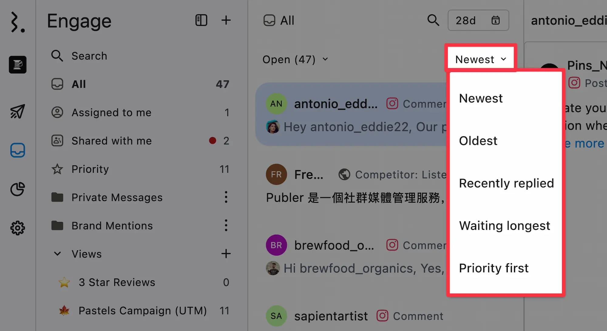デフォルトにより、エンゲージ内の全ての受信箱で、過去30日間の会話がオープンの状態で新しい順に並べられます。必要に応じて、会話を分類することで、並び替えが可能です。