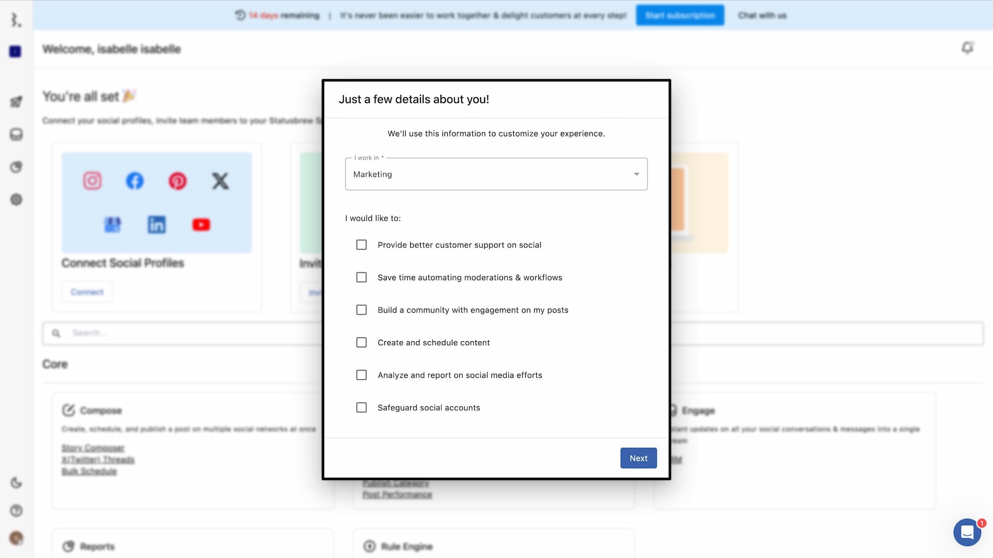 Statusbrewでは、有料プランをご契約いただく前に、すべての機能を体験いただける7日間もしくは14日間の無料トライアルをご利用いただくことが可能です。Statusbrewが提供する様々なスケールのソーシャルメディア管理に適した全機能を、是非このトライアルを利用して体験してください。