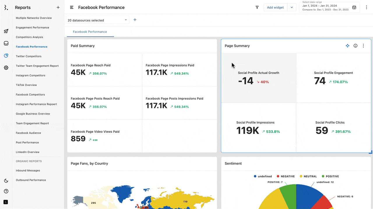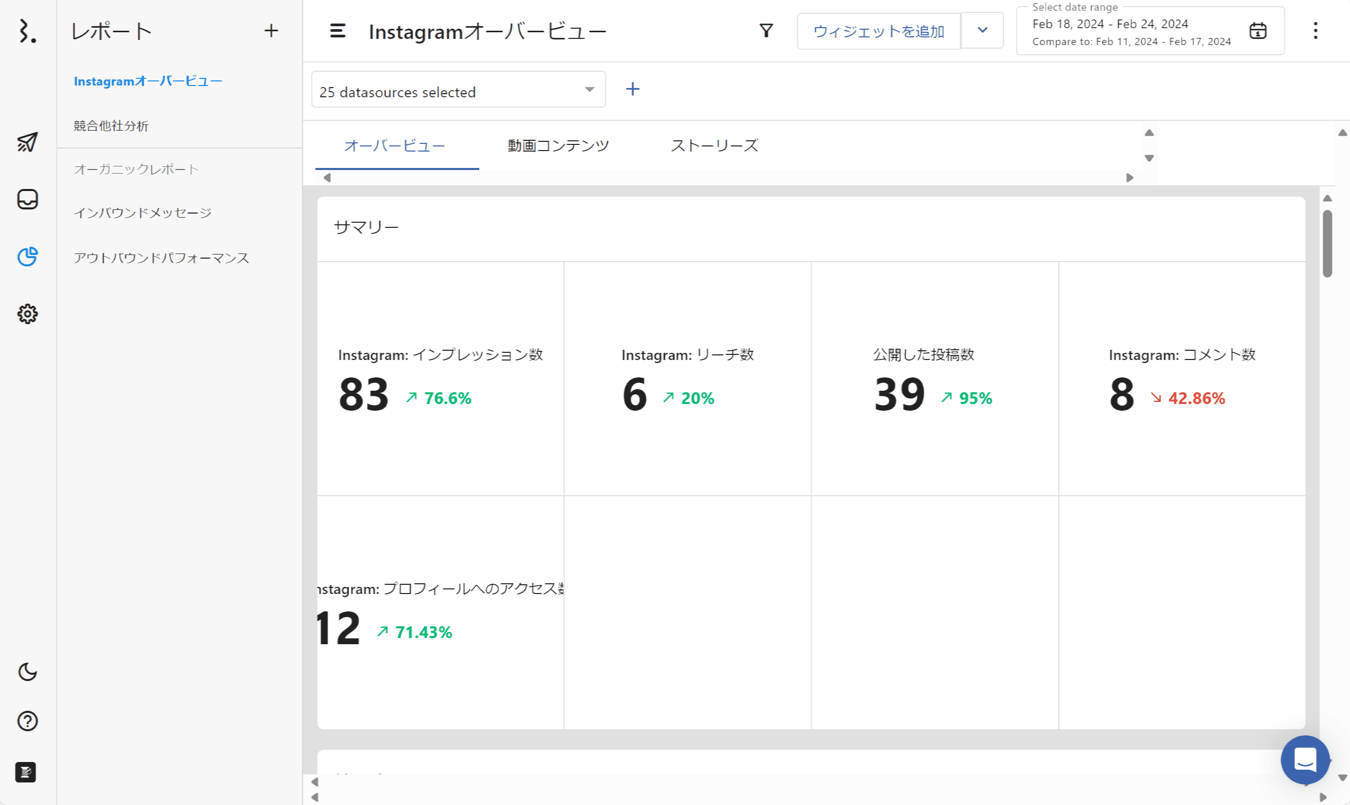 こちらはナンバーチャートを用いたウィジェットです。指定した期間(2024年2月18日~2024年2月24日)のデータを単一の数値で表します。左上の「Instagram: インプレッション数」では、指定した期間中にトータル83件のインプレッションを獲得したということです。そして比較期間を設定すると、数値の横に比較したデータが表示されます。こちらでは、76.6%上昇したというデータになります。プラスだと緑、マイナスだと赤で表示されます。