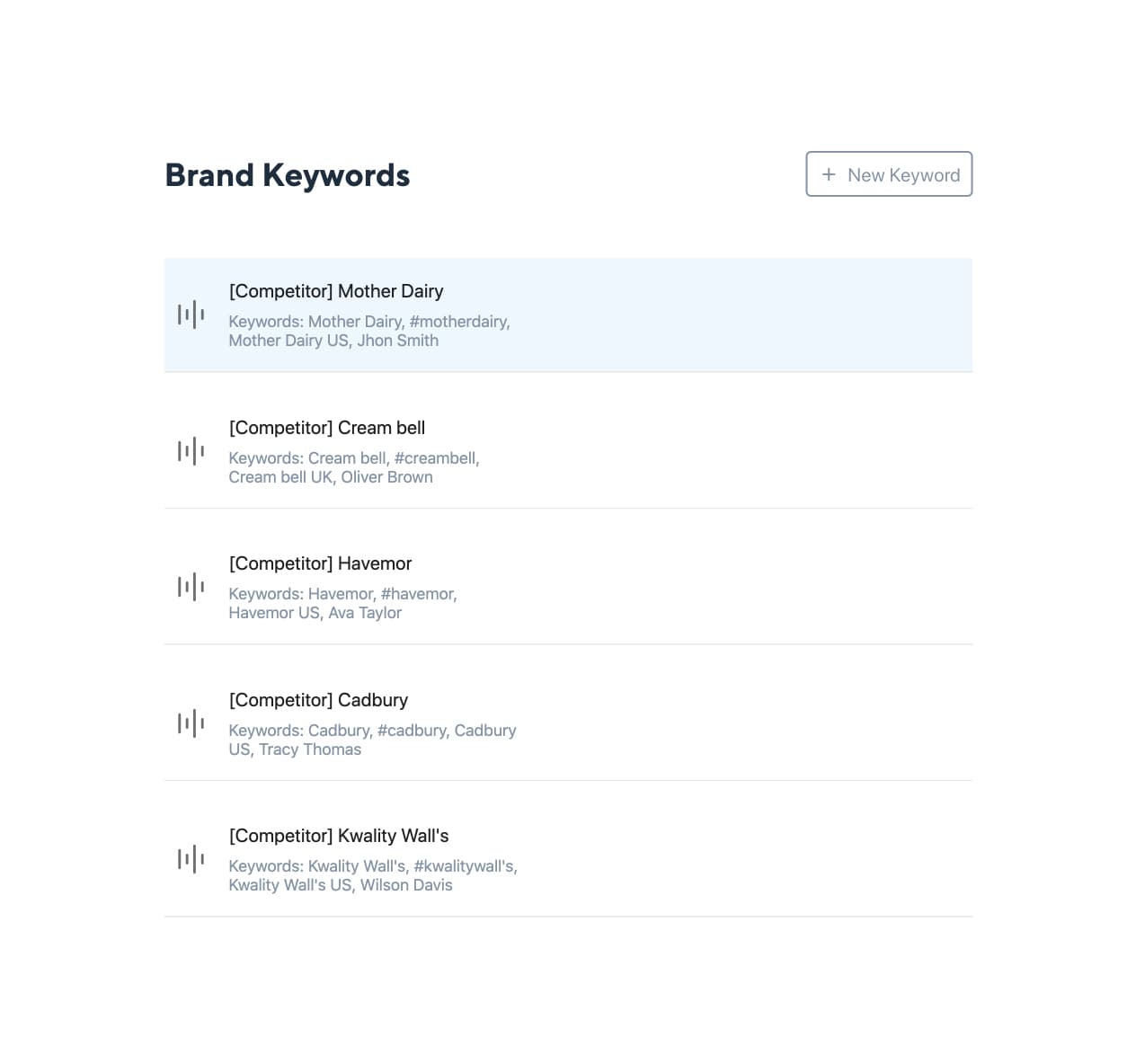 競合他社のキーワードリストに最初に追加するべきことは、競合他社のブランド名、あなたが興味のある製品名、そしてソーシャルメディアのユーザー名です。存在する他のユーザー名も是非追加しましょう。