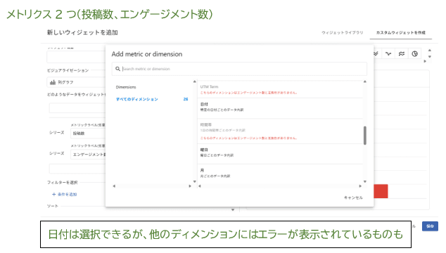 シリーズを追加をクリックし、メトリクス:①投稿数、②エンゲージメント数を選択>X軸を追加してディメンション:日付を選択します。このとき、日付は選択できますが、一部のディメンションにはエラーが表示されます。