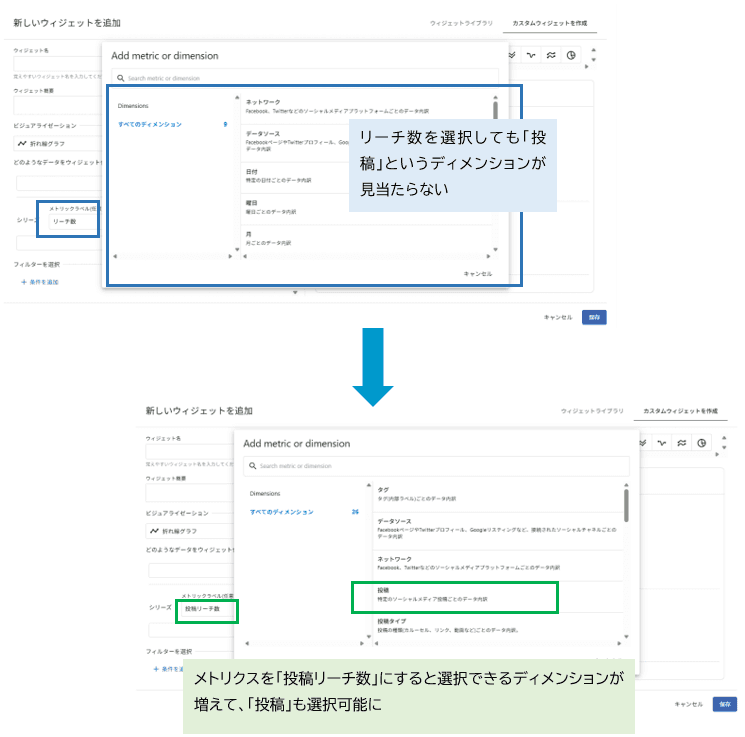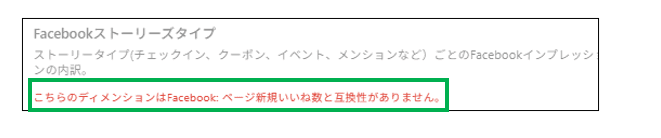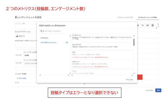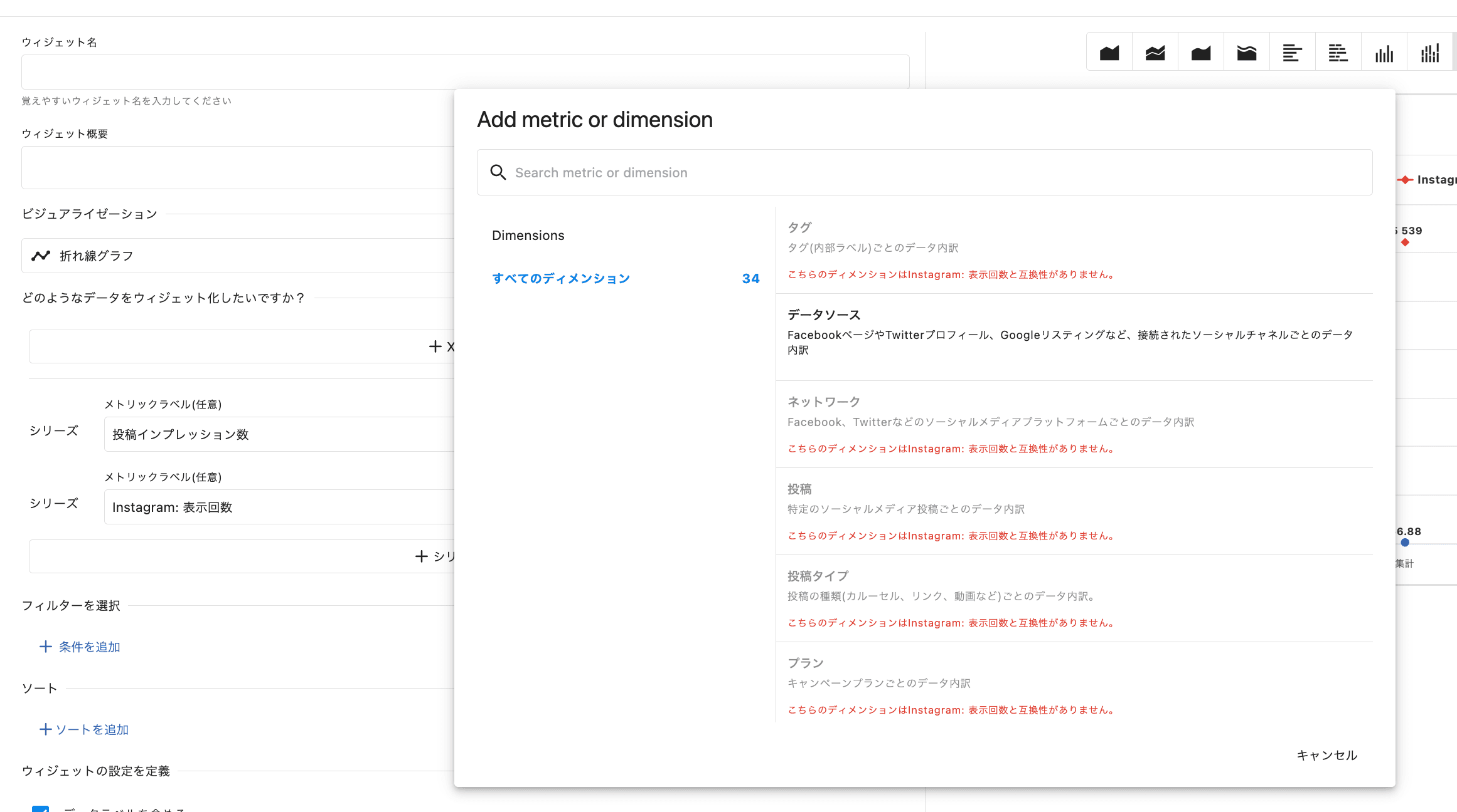 互換ディメンションが異なっている場合:組み合わせを見直します。または別々のウィジェットを作成しましょう。(例:投稿数×Instagramストーリーズ数×ネットワークではエラーとなるので、① 投稿数をネットワーク別に表示するグラフと、②ストーリーズの投稿数を示すグラフを別々に作成する)